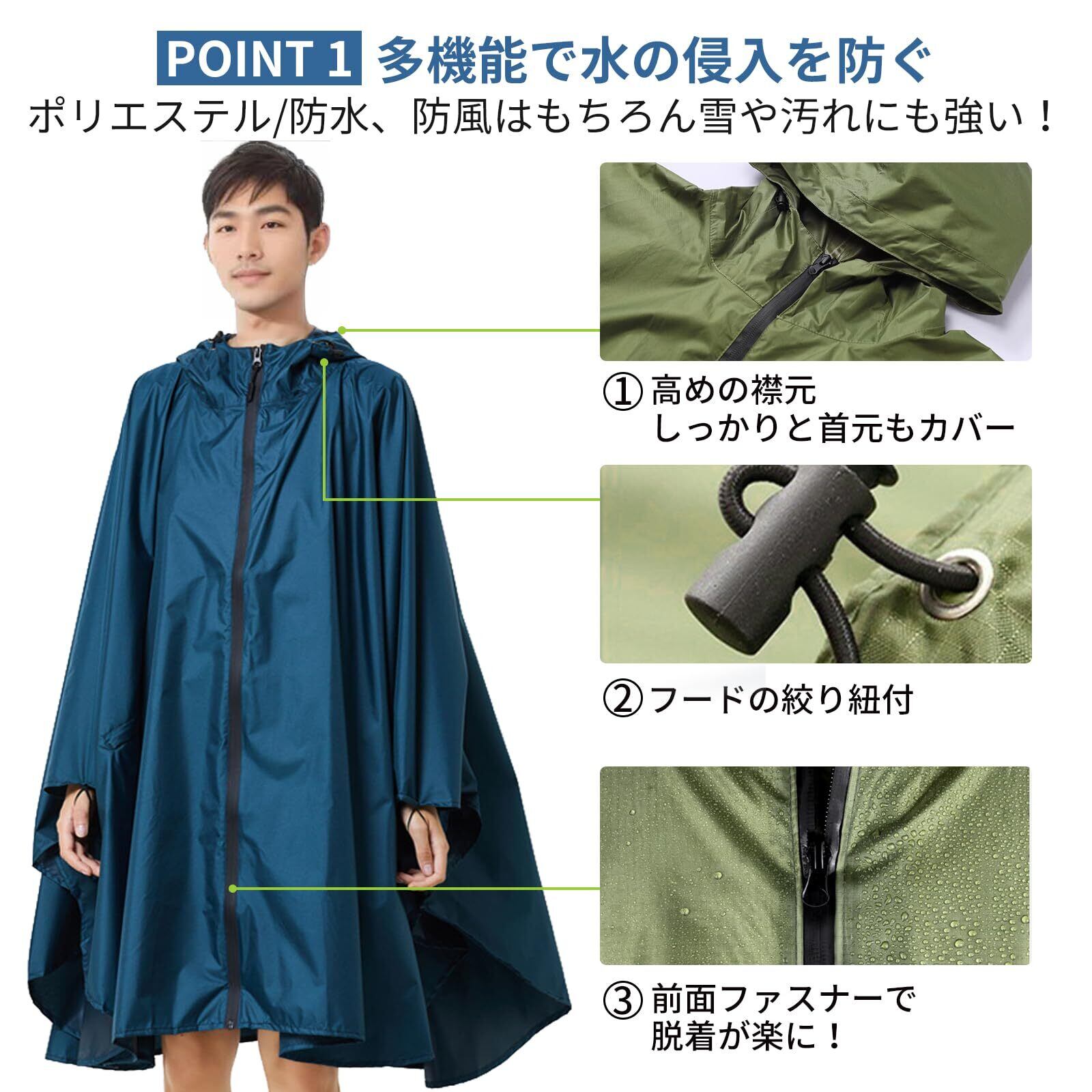 【人間化されたデザイン】 ①このレインコートは膝下までしっかりカバーできる長さで、男女兼用のゆったりシルエットが特徴です。②側面のボタンを開ければ、大容量のリュックやバッグを背負ったままでも快適に着用できます。③帽子には調節可能なストラップが付いており、自由に調節が可能。さらに、大きめのツバは雨水をしっかり防ぎます。④レインコートの縁にはハトメが付いており、テント用の杭に固定してマットやサンシェードとしても活用可能です。⑤前面には大容量の防水ポケットがあり、雨天でも必需品を安全に携帯できます。