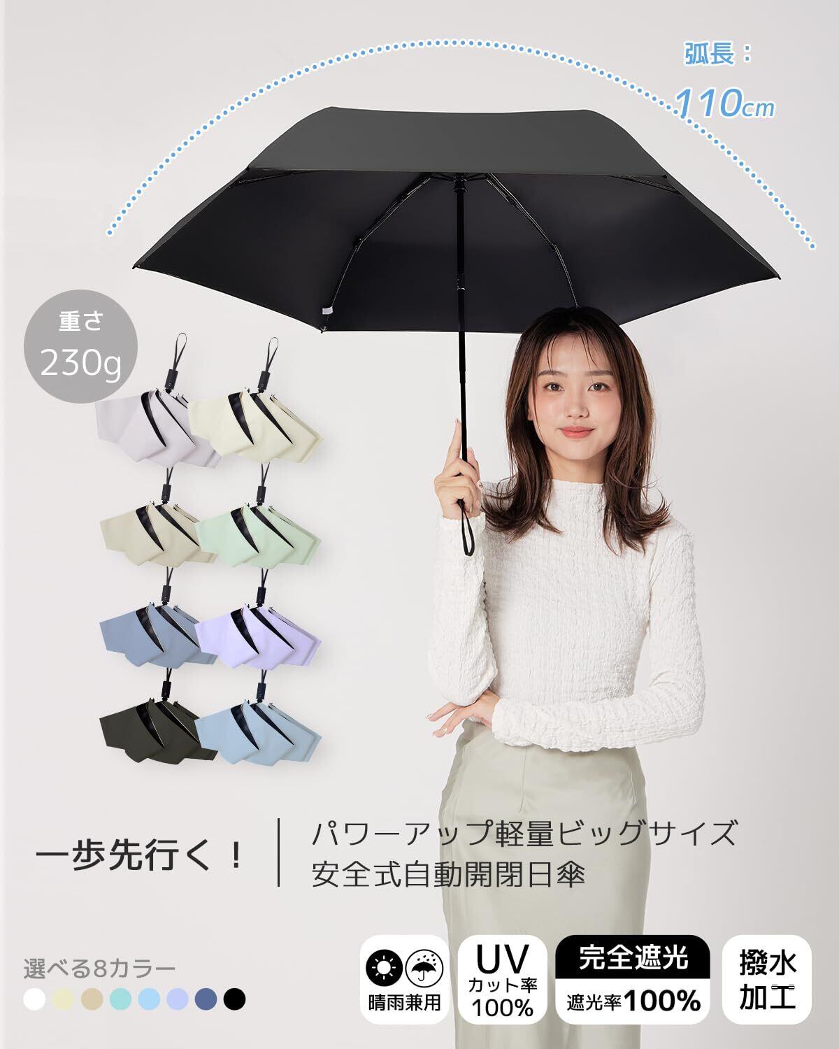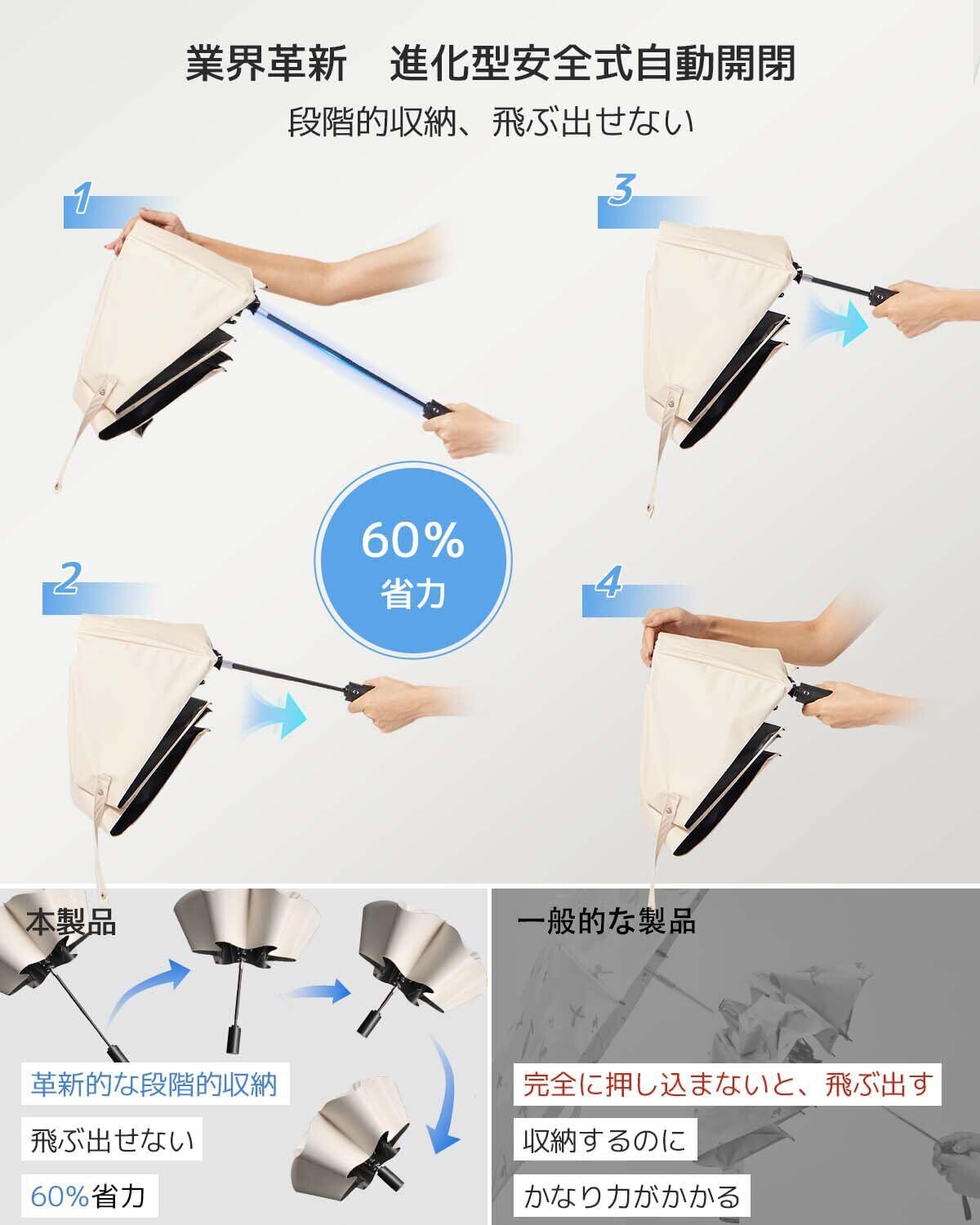 【晴雨兼用&超撥水性】優れた抗水性を備えた310T防水ファブリック生地を採用し、特別な加工により、出色の撥水性能を実現しました。使用後に軽く振るだけで傘が乾きます。また、内側は多層コーティング処理が施されており、紫外線を効果的にカットしますので、日よけとしてもご利用いただけます。