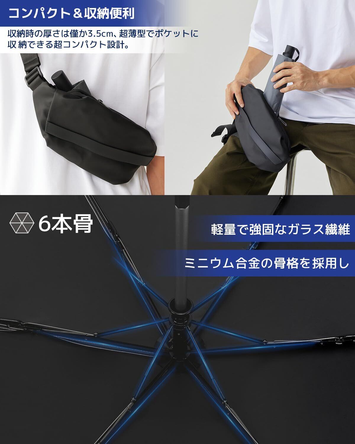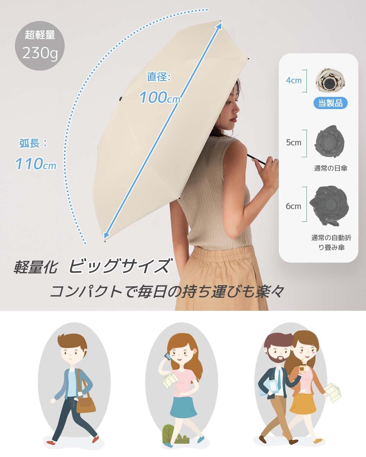 【コンパクト、超軽量、ビッグサイズ、頑丈】konciwaの折りたたみ傘は、最先端の軽量で丈夫なグラスファイバーとアルミ合金の骨組みを採用し、軽量性、コンパクトさ、頑丈さを実現! 開いた状態の直径は100cm、収納時の厚さは僅か3.5cm、超薄型でポケットに収納できる超コンパクト設計! さらに、約230gの重さは非常に軽く、毎日の持ち運びに最適! 通勤・通学、旅行、ハイキング、スポーツなど、あらゆるシーンで幅広く利用でき、老若男女問わず幅広い世代の方々にご利用いただけます!