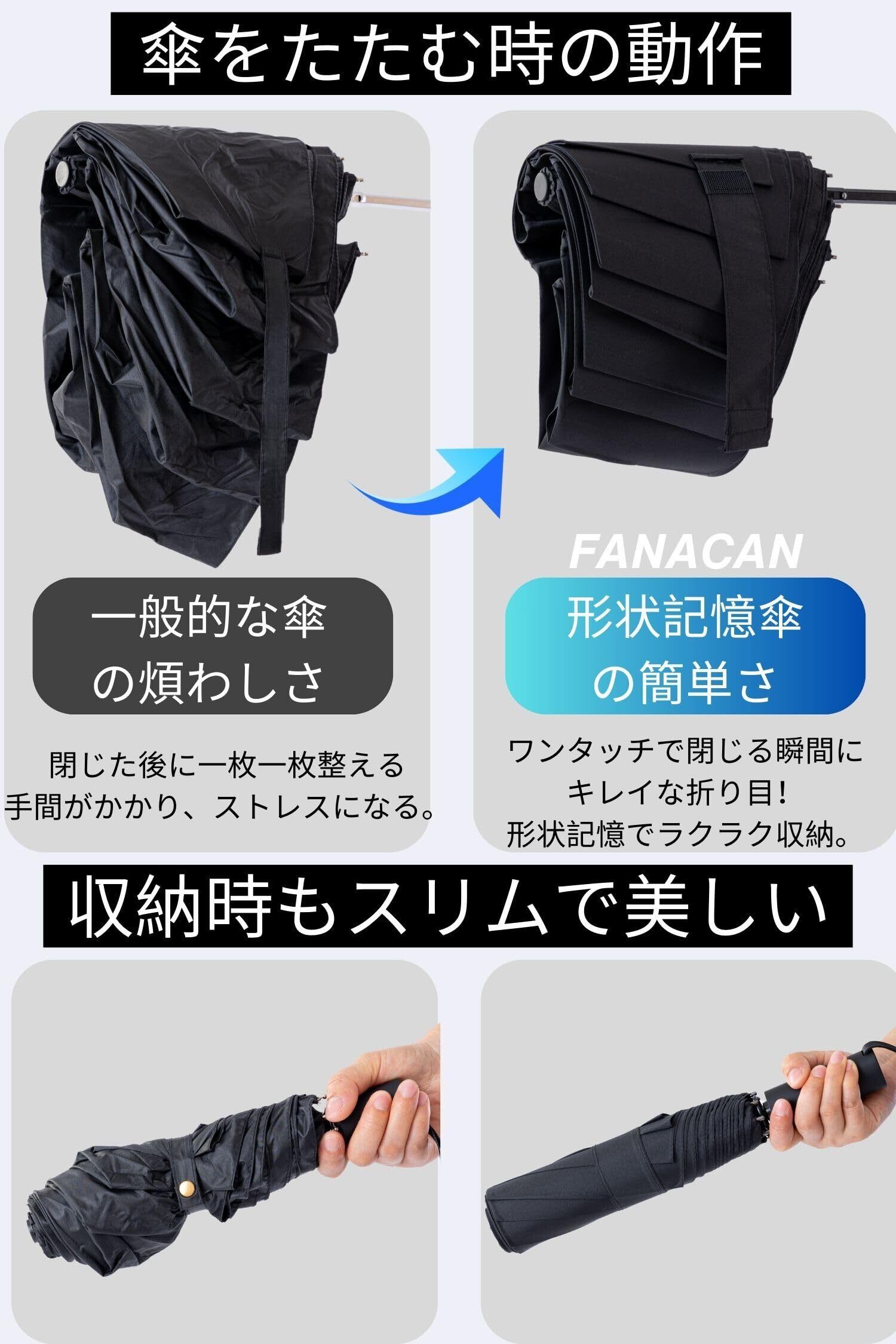 【永久形状記憶折りたたみ傘】これまでの折りたたみ傘にありがちな煩わしさを解消します。一般的な傘は、折りたたむのが面倒で、どうしてもぐちゃぐちゃになったり、スムーズにたためずにストレスを感じたことはありませんか?FANACAN傘は、独自の形状記憶生地3.0を採用しているため、折り目加工だけでは実現できない驚くほどの折りたたみやすさを実現。誰でも簡単に美しくたためるため、毎日の使用が格段に快適です。 さらに、一般的な形状記憶傘(折り目加工のみ)の効果が2〜3年で薄れてしまうのに対し、FANACAN傘の形状記憶効果は永久的に持続します。つまり、一度購入すれば、買い替えの手間もなく、長期間その便利さを体感していただけます。 雨が降るたびに傘を使うのが面倒、たたむのが苦手…そんな悩みをFANACAN傘で解消しましょう。これ一つで、毎日の傘ライフがもっと快適になります!