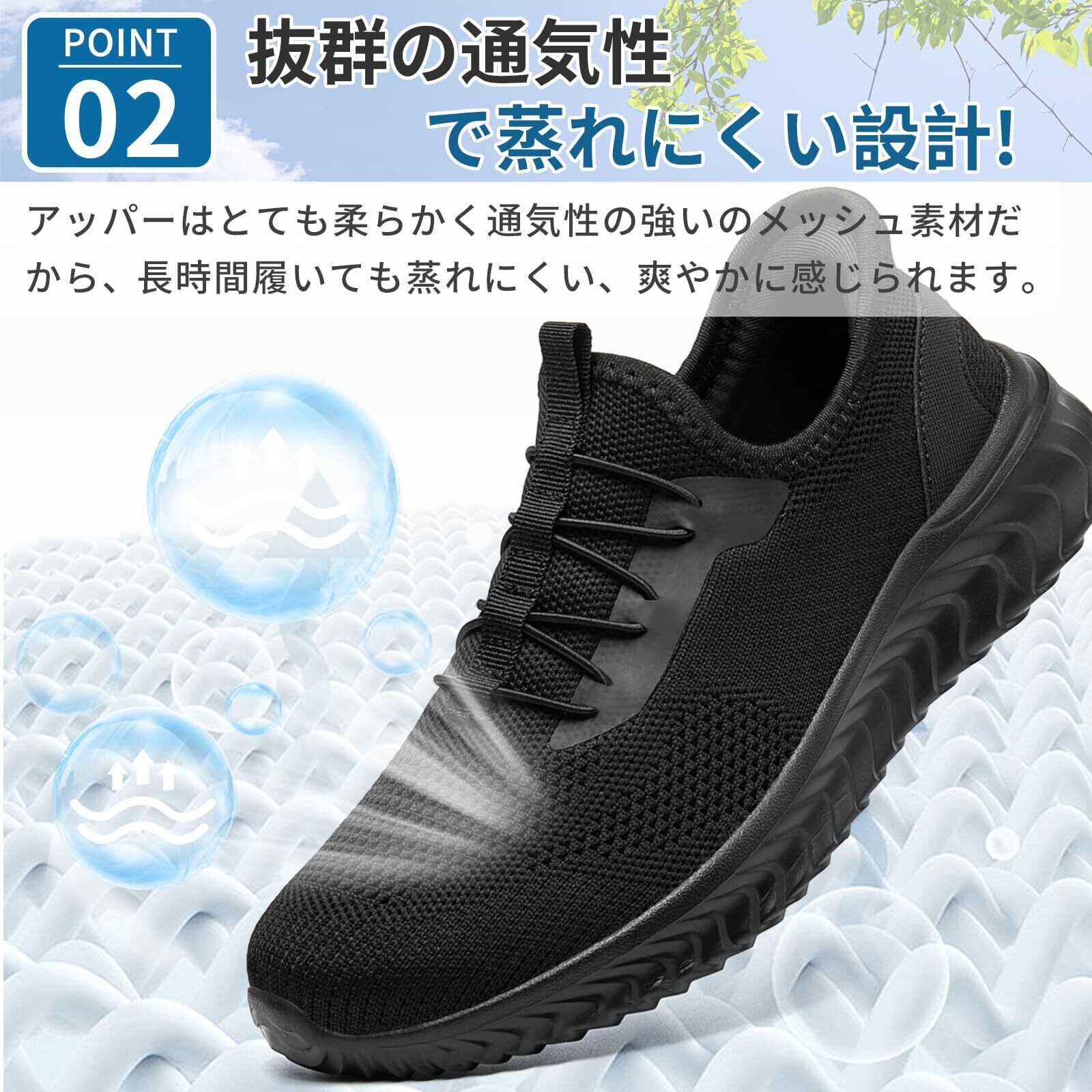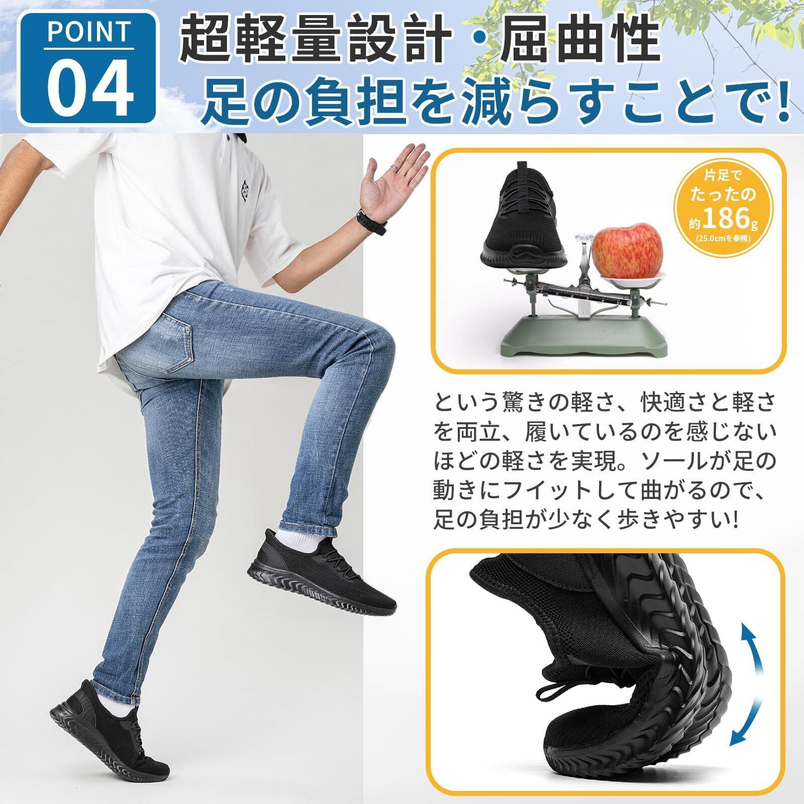 立ち仕事靴 軽い:片足わずか約186gの超軽量設計で、まるで靴を履いていないかのような軽さです。EVA素材を使用したソールはクッション性に優れ、長時間歩いても足への負担を軽減します。立ち仕事や通勤、長時間の移動など、足を酷使するシーンでも、負担を感じさせない快適さが特徴です。軽くて疲れにくいので、毎日快適に過ごせます。