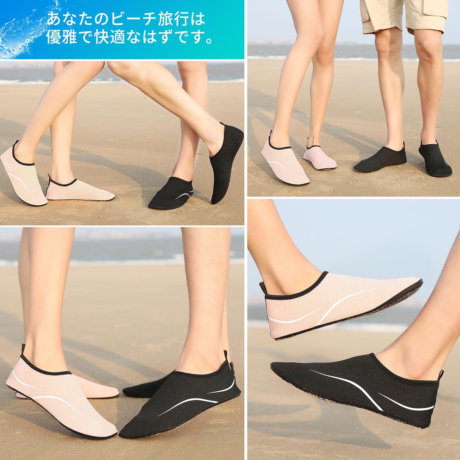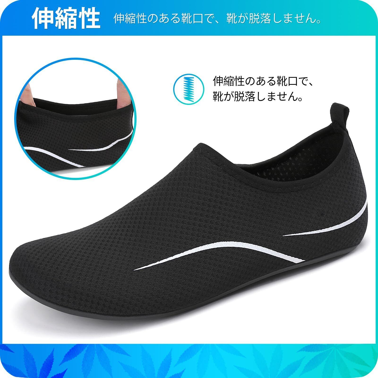 【インナー素材】 ウォーターシューズのインナーはポリエステル+スパンデックス製です、これにより、ウォーターシューズは吸水性と速乾性に優れています。また、360度自由に曲げることができ、靴下のようにしなやかで、履いていても素足のような履き心地で、履き心地も抜群です。