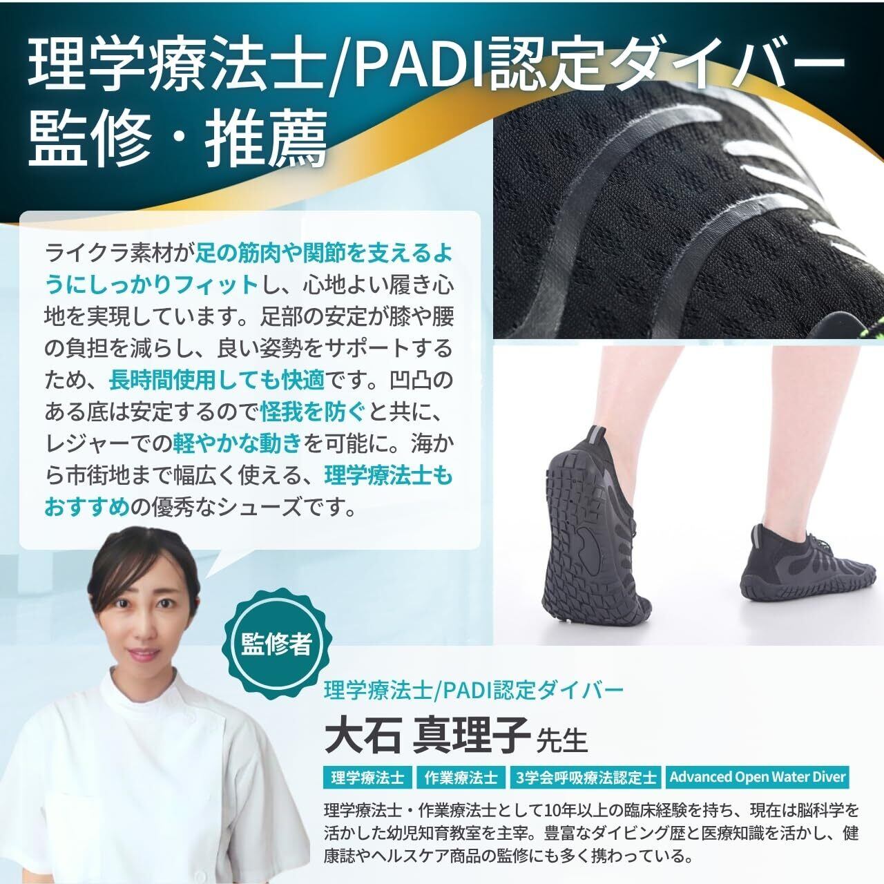 【極上の動きやすさ】アッパー部分の素材にライクラを使用!1959年に米国デュポン社で開発された、4~7倍にも伸び縮みする化学繊維のことで、伸縮性に加え、型くずれしにくく動きやすいのがライクラの特徴です。スパンデックスより伸縮性や型崩れしにくい特徴があり、とても動きやすいシューズです。また、湿った場所でもカビが発生しない特別な化学構造になっており、防カビとしても優れています。ソール部分(靴底)は、ある程度厚みのあるゴム素材でペラペラな感じはありません。靴底にはしっかり凹凸があり、グリップがきいて滑りにくく、安全な履き心地を実現しています。
