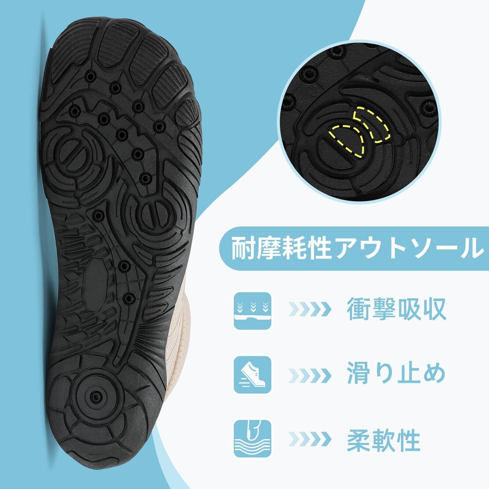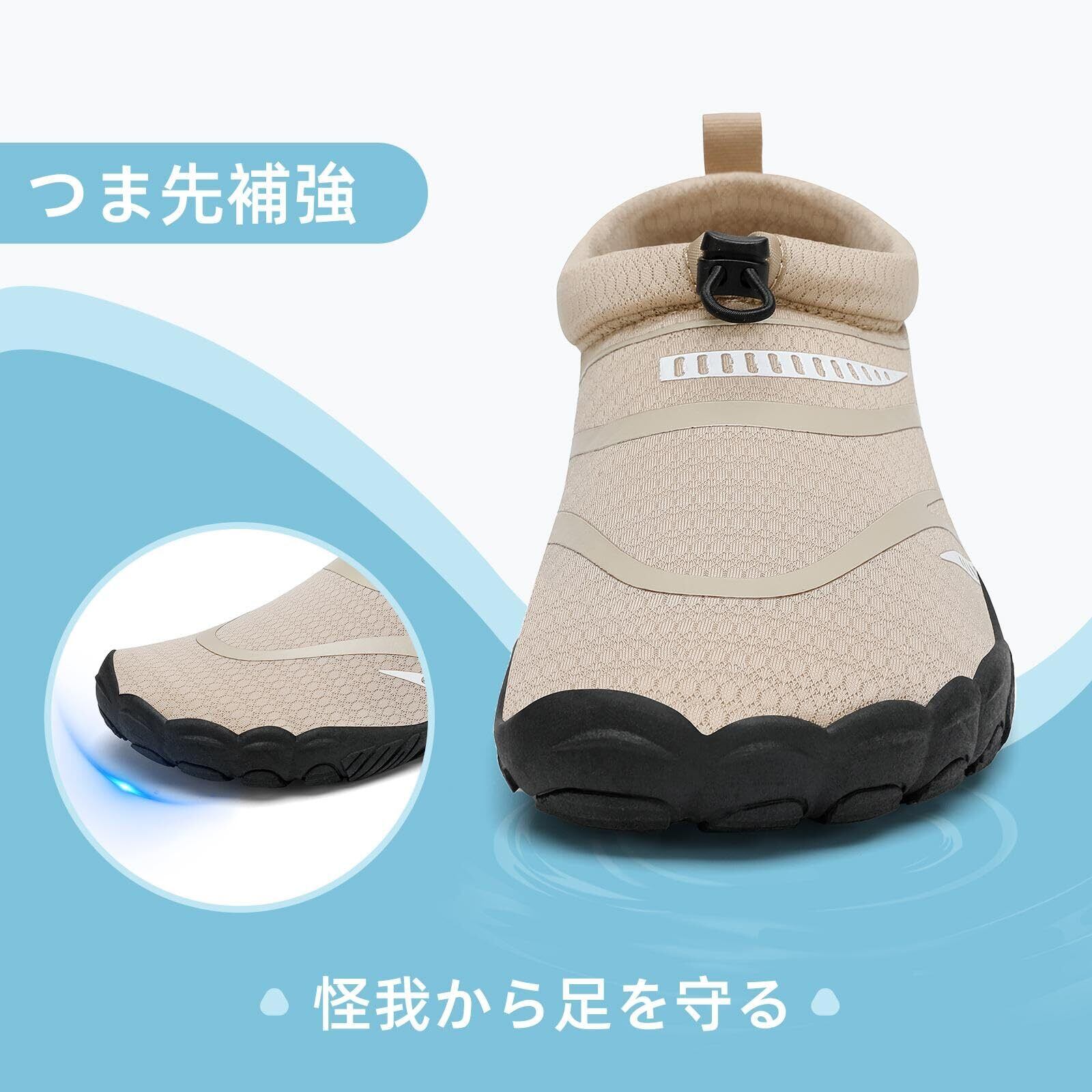 厚底:靴底には凹凸のテクスチャーがデザインされており、優れたグリップ力を提供します。厚めのデザインにより、熱い砂、ウニ、石、荒れた地面、鋭い物体から足を保護します