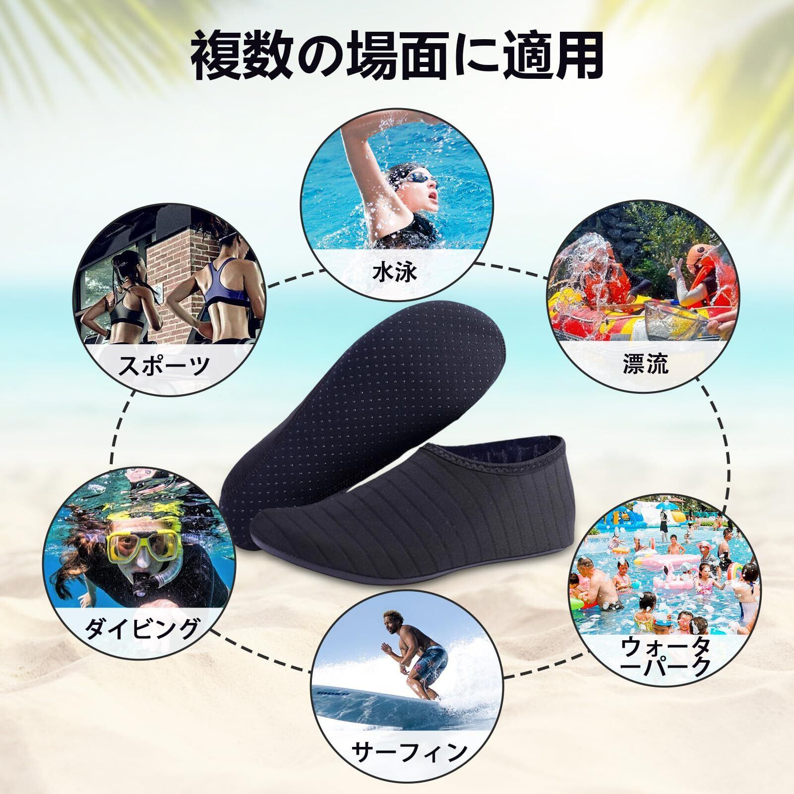 【安全を守る】グリップ力のある厚めの加工が施され、リーフ、ビーチ、プールサイド、ヨガマットなど、滑りやすい場所での転倒を防ぎます。また、砂利や貝殻によるキズを防ぎ、クラゲやウニなどの海洋生物によるケガを軽減し、安心してウォーターアクティビティを楽しめることができます。