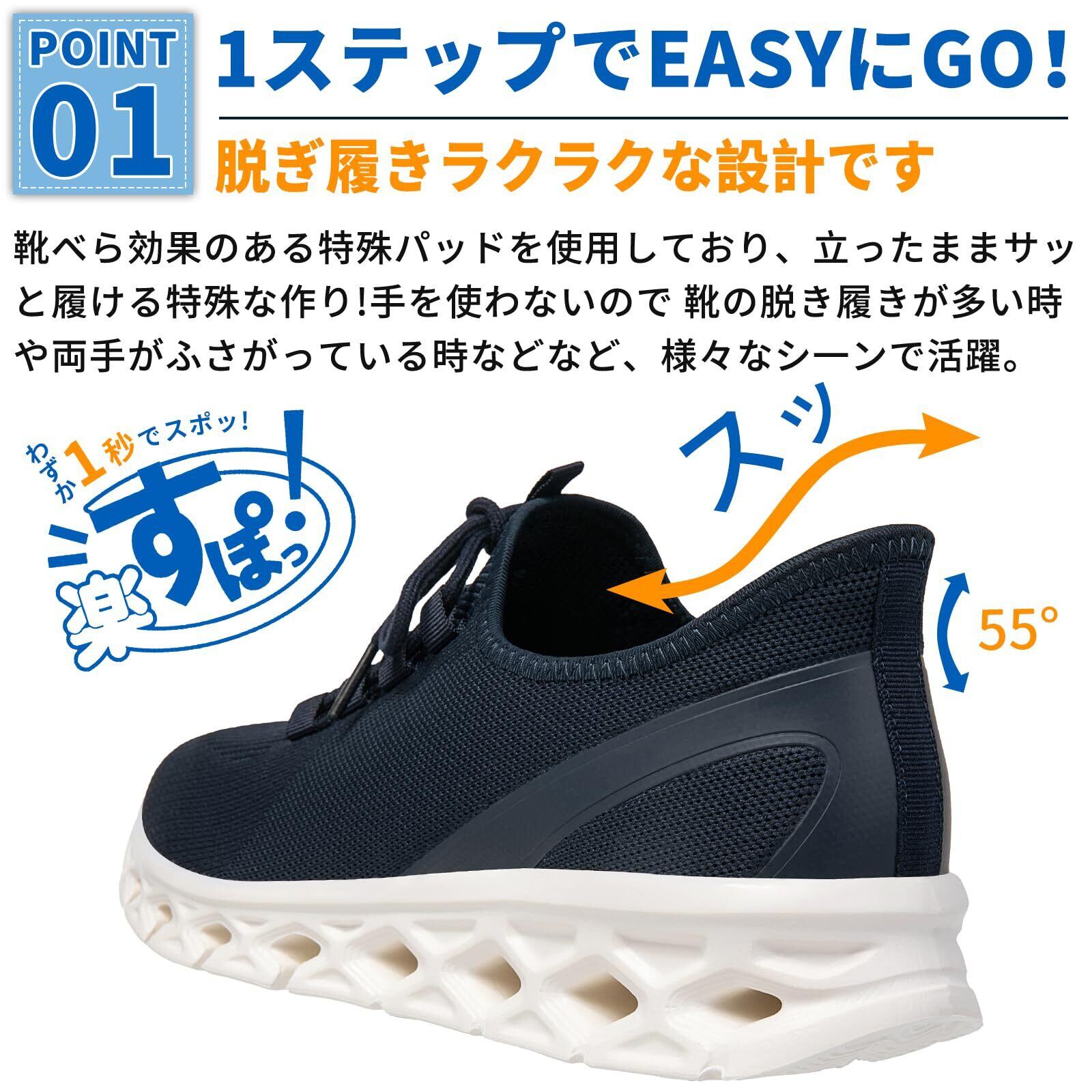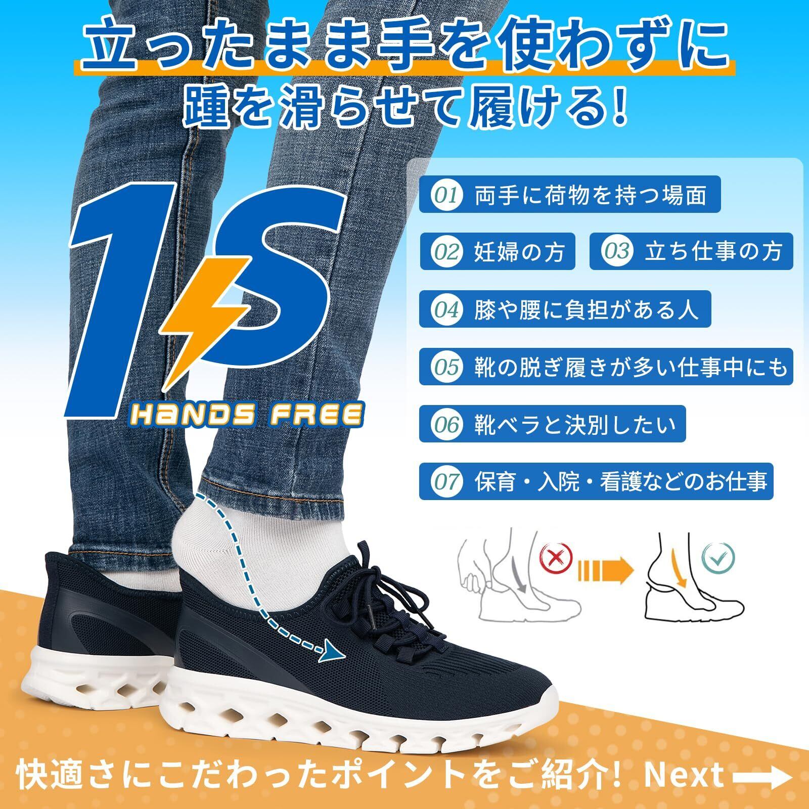 手を使わずに履ける履きやすい靴 スニーカー。その名の通り「手を使わずに 立ったまま スパッと履ける!」特別な作りを実現しました。かがまず履ける。触らず履ける。本当です。メッシユアッパ一なので通気性が良く、長時間履いても靴内が蒸れにくい設計です。25.0 cm片足で186gと、超軽量設計でストレスフリーな履き心地。 ゆったり感のある幅広EEEウィズ設計。キレイが保てる外せるインソ一ル、低反発素材を使用することで衝撃を吸収してくれます。足を優しく包み込み、負担を軽減するので、ストレスなく履ける快適な履き心地を実現。脱ぎ履きもラクチンでとても便利で、普段履きや室内履きとしてはもちろん、お散歩や運転、介護やナースなどの長時間の立ち仕事、通勤、旅行の際の履き替え用などにもおすすめです。靴を頻繁に着脱する必要のある仕事の人や、年配の人、妊娠中の人も屈まずに靴を履くことができる優しいシューズとなっており、面倒くさがり屋さんにもお薦めだ。