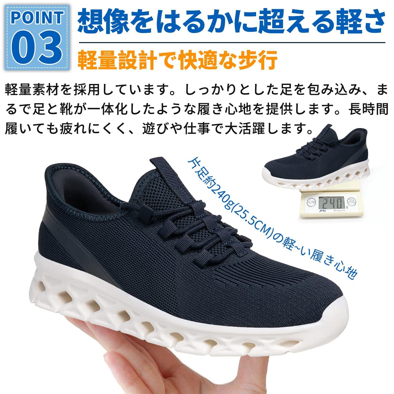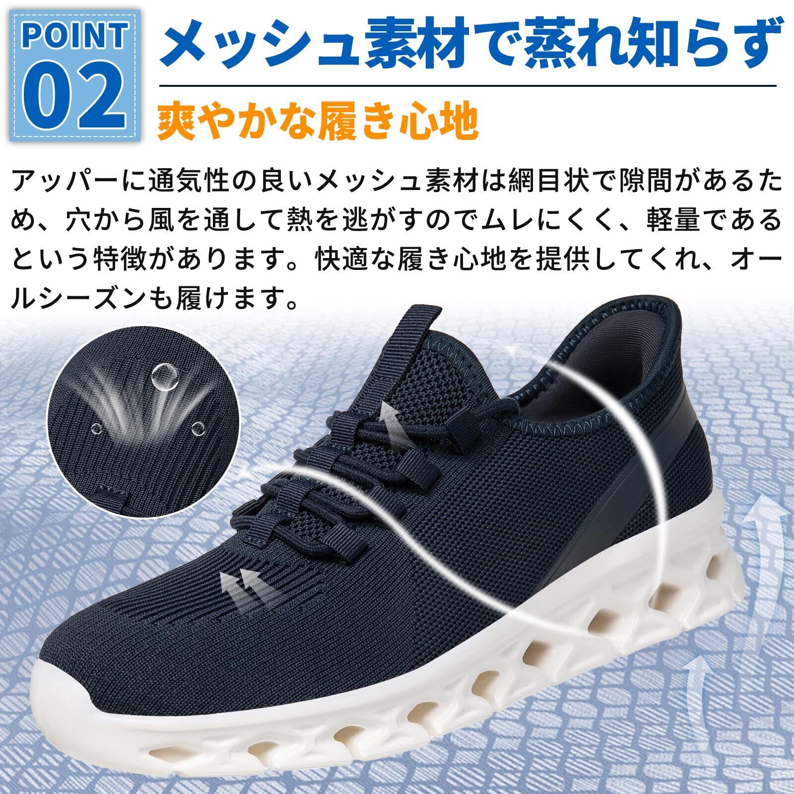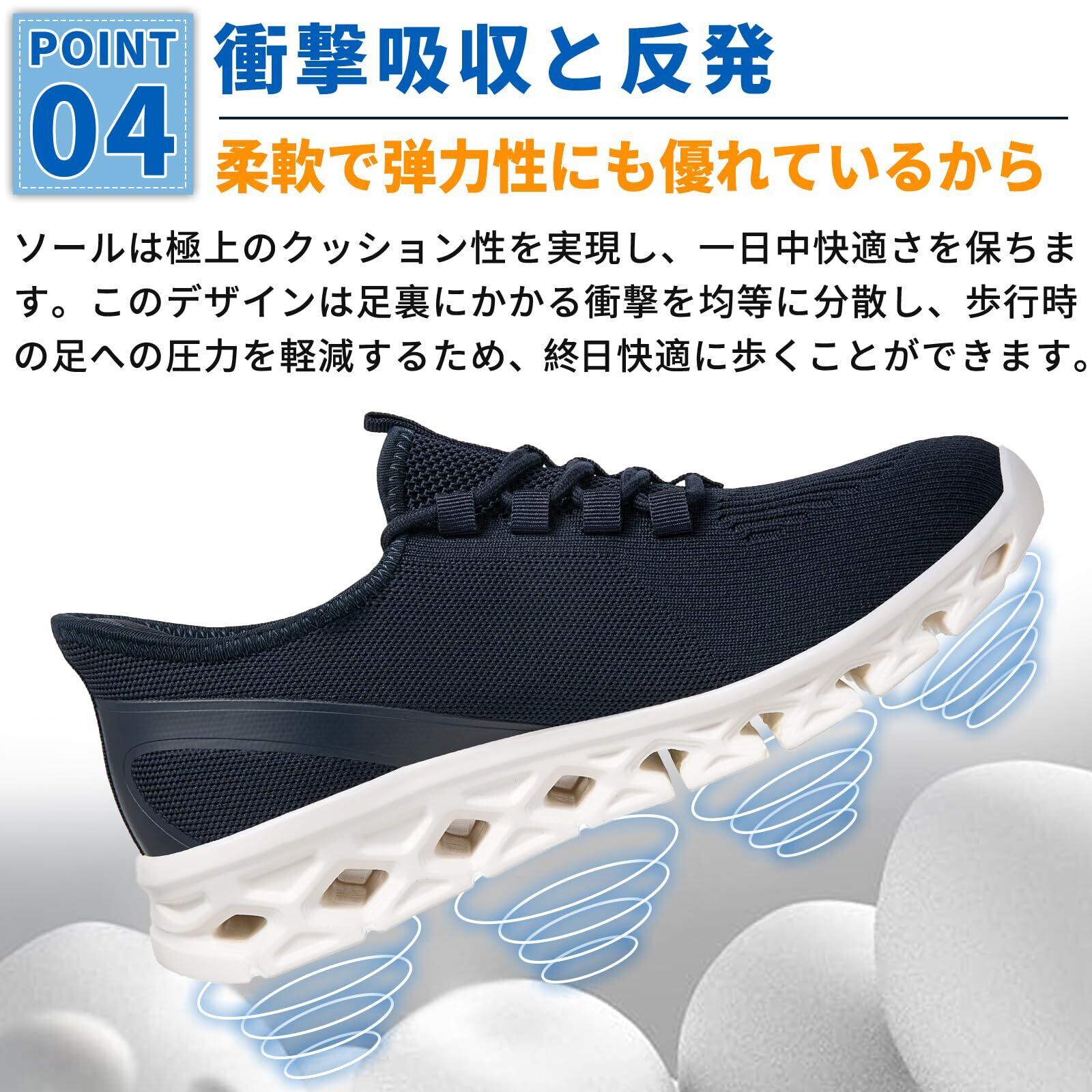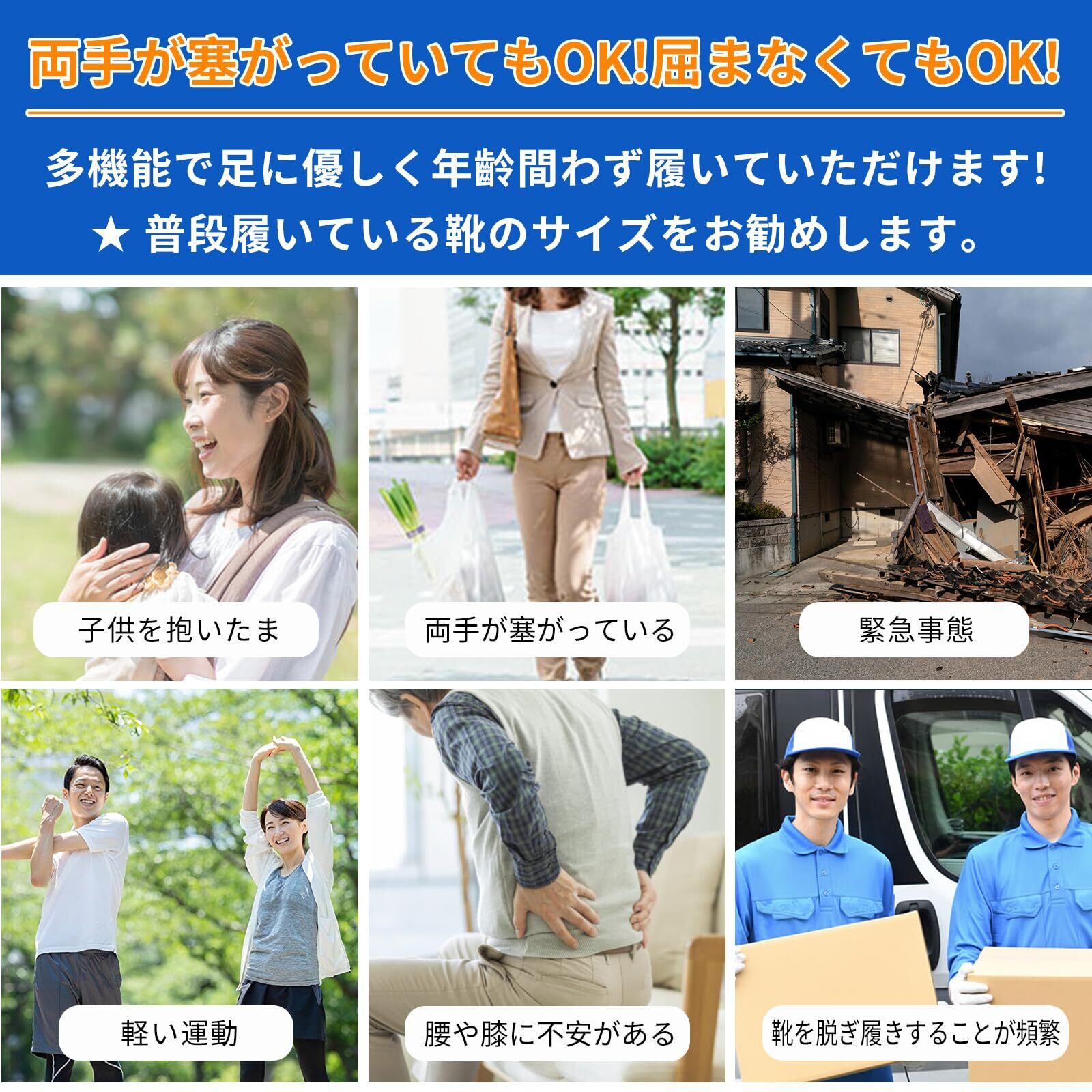【立ったまま簡単に履けるデザイン】忙しい朝でも、靴べらなしで立ったままで簡単に履けるデザイン。靴紐やバンドの調整も不要で、準備時間を大幅に短縮できます。家事や育児に忙しい方や、通勤を急ぐビジネスマンに最適。朝の時間を有効に使える、便利でスムーズな履き心地を提供します。