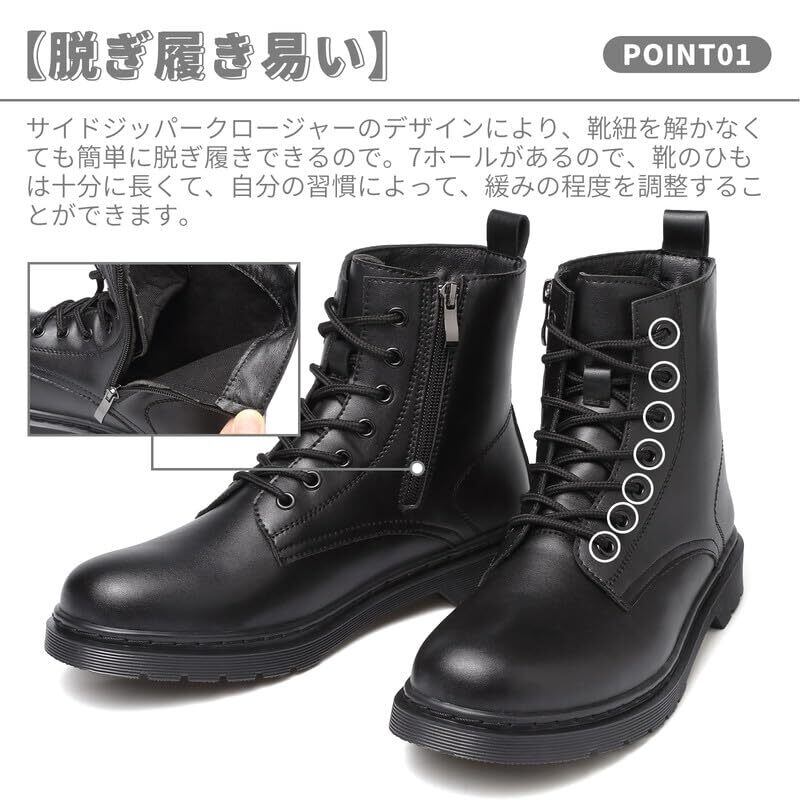 【脱ぎ履き易い】サイドジッパークロージャーのデザインにより、靴紐を解かなくても簡単に脱ぎ履きできるので、忙しい朝や急いでいる時にも便利です。靴の口はひものデザイン方式を採用して、7つの穴があって、緩みの程度を調整することができます。