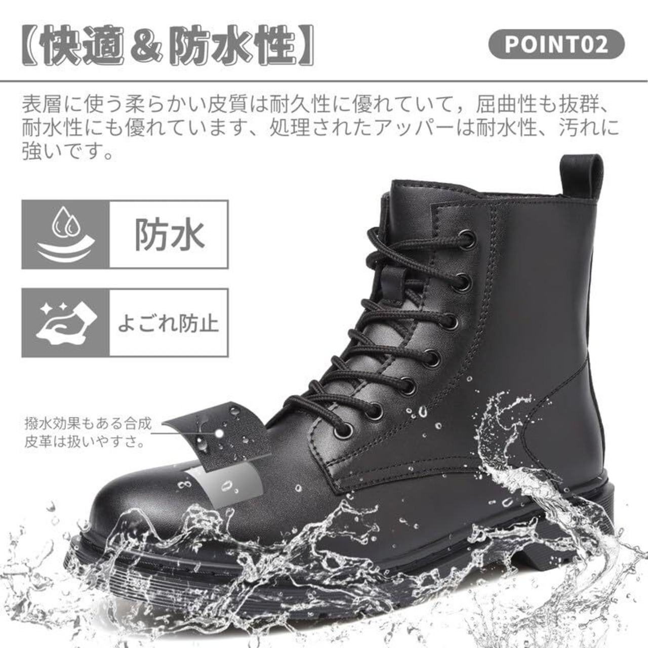 【快適&防水性】マット寄りの黒皮には少し光沢があり、高見えする上質な質感が特徴です。表層に使う柔らかい皮質は耐久性に優れていて,屈曲性も抜群、耐水性にも優れています、雨の日などの悪天候の日でも履くことができます。