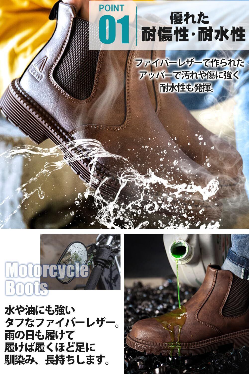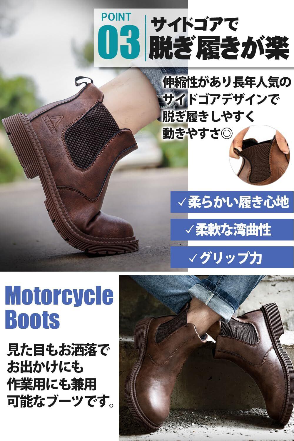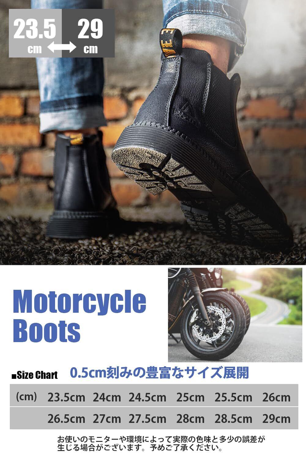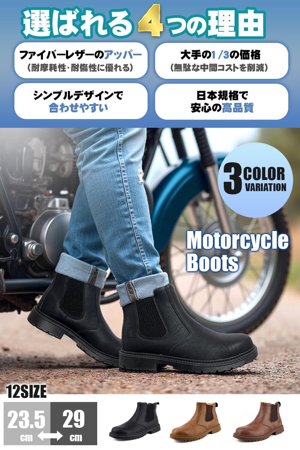 ・耐摩耗性と耐傷性に優れたアッパーは、水はもちろん油にも強い頼もしい耐性を発揮します。雨の日にも使えてオイルがかかっても安心のファイバーレザー生地は 履けば履くほど足に馴染み、長持ちします。一足あれば万能に使えるバイクブーツです。 ・つま先部分には安全性を極めた鋼鉄製の先芯を搭載。シフトチェンジがしやすくペダル操作時の摩擦から足を守る補強設計。 バイクツーリングやアウトドア、DIYなど、あらゆるシーンで大切な足元をしっかりと守ります。 ・伸縮性が抜群で、着脱の快適さから長年人気のサイドゴアデザインを採用。 足首の可動域を確保しつつ、必要な部分はホールドしてくれるので、ブレーキ操作時の細かなコントロールがしやすい設計です。 ・ペダル感覚が伝わりやすい適度な薄さのソール。バイク特有の振動を吸収するクッション性と グリップ力が高く防滑、耐摩擦性を兼ねるアウトソールで、停車時の濡れた道でも滑りにくい仕様です。 ・蒸れにくいメッシュ素材のインソールとしなやかに足にフィットするので長時間のライディングも疲れにくい。 0.5cm刻みの豊富なサイズバリエーションで、理想のフィット感に出会えます。ジャストサイズだからこそ味わえる、至福の履き心地をぜひ体験してください。 ■サイズ:23.5cm / 24cm /24.5cm / 25cm / 25.5cm / 26cm / 26.5cm / 27cm / 27.5cm / 28cm / 28.5cm / 29cm ■カラー ブラック、カーキ、ブラウン