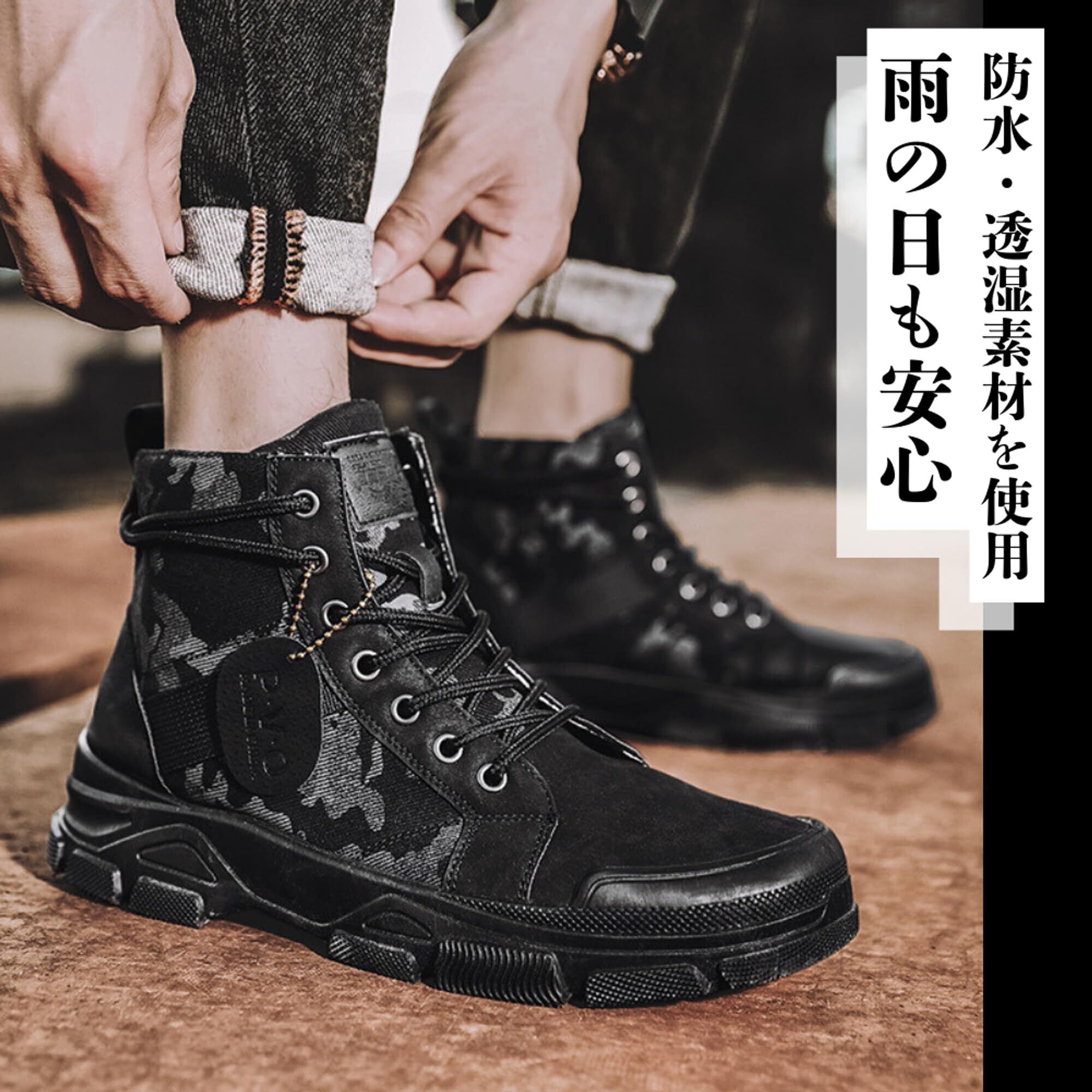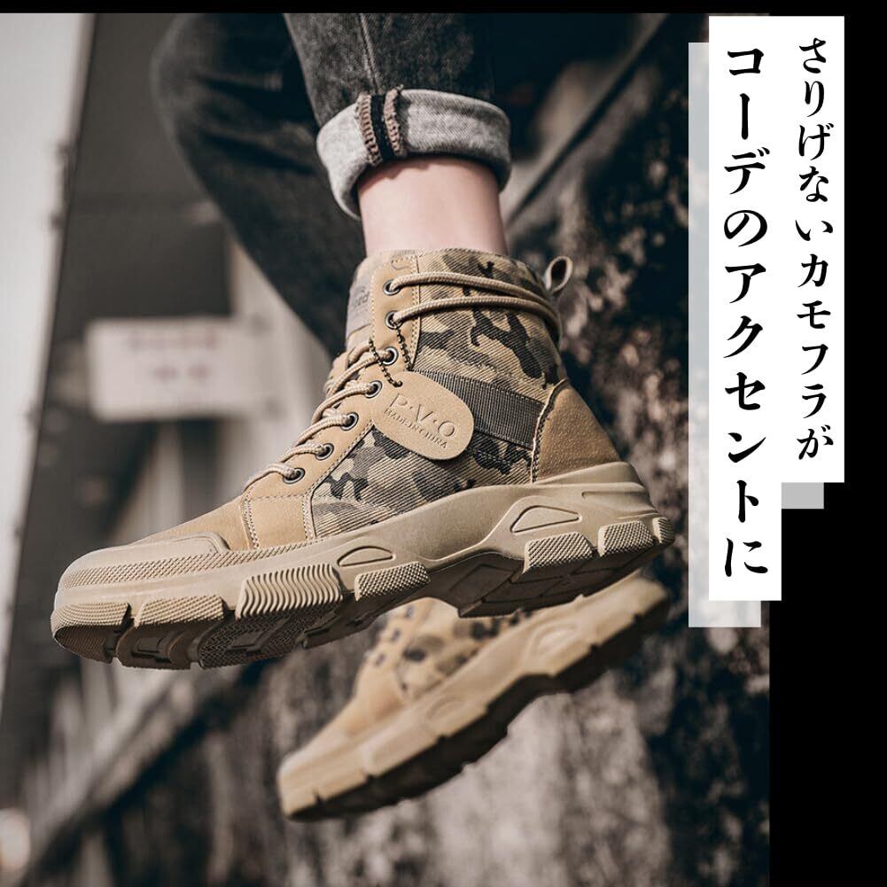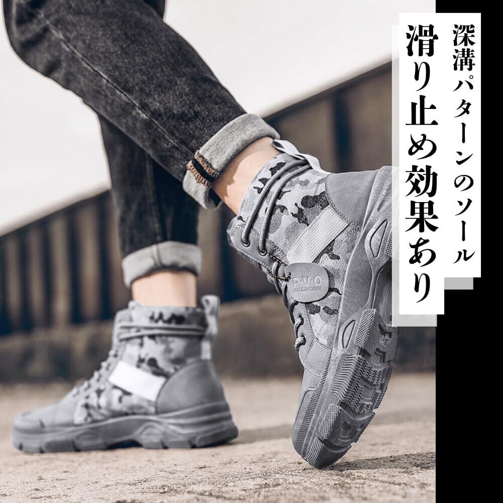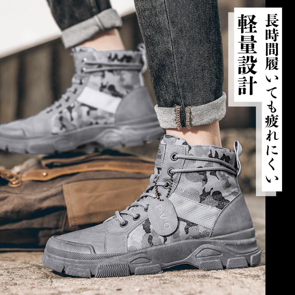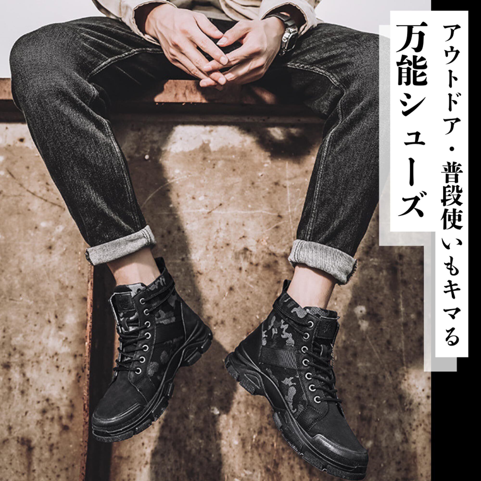 【サイズ】6サイズ展開: 24.5cm、25.0cm、25.5cm、26.0cm、26.5cm、27.0cmまで、幅広いサイズに対応しています。 自分の足にぴったりのサイズをお選びいただけます。 【カラー】3色展開: ブラック、グレー、カーキの3色をご用意しています。 どのカラーも迷彩柄で、様々なコーディネートに合わせやすいです。