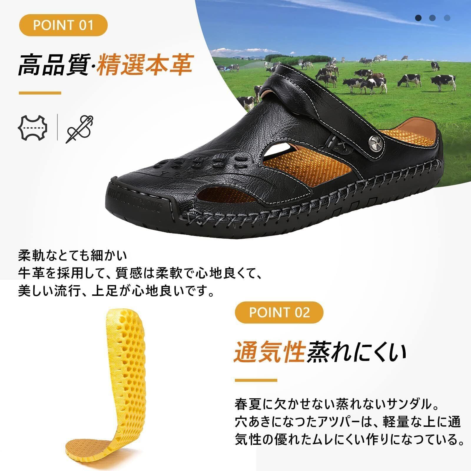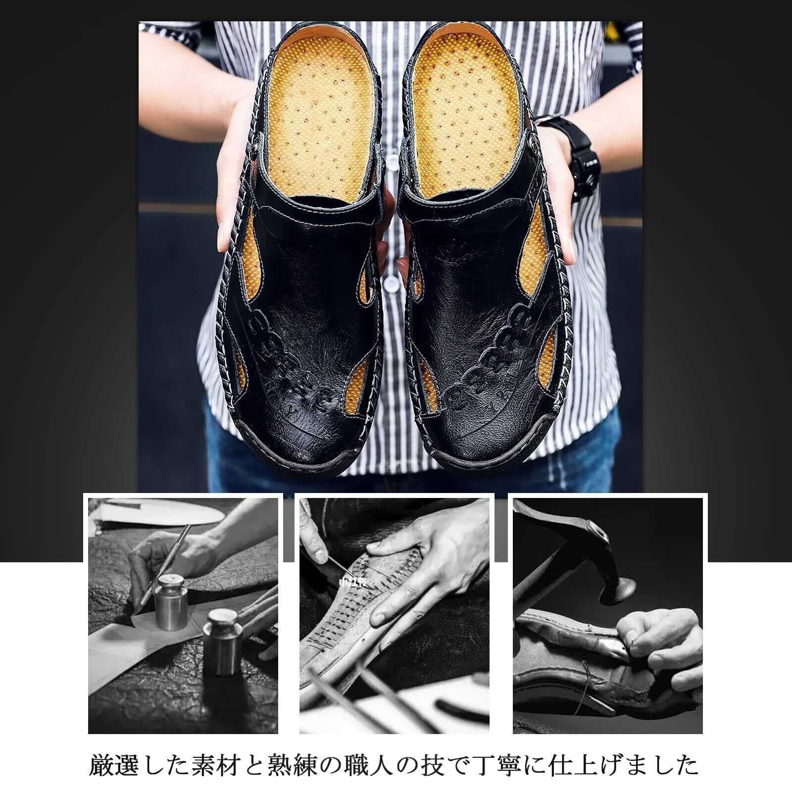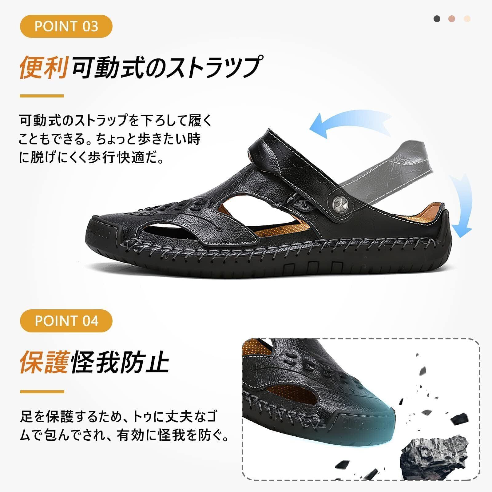 【本革・おしゃれ】精選上層部牛革を使用され、滑らかで柔らかいです。更に光沢感があり、質感がグッとアップしてくれます。本革なので、濡れても大丈夫!耐久性が素晴らしいです。この夏はこの1足のサンダルで十分に快適になります。