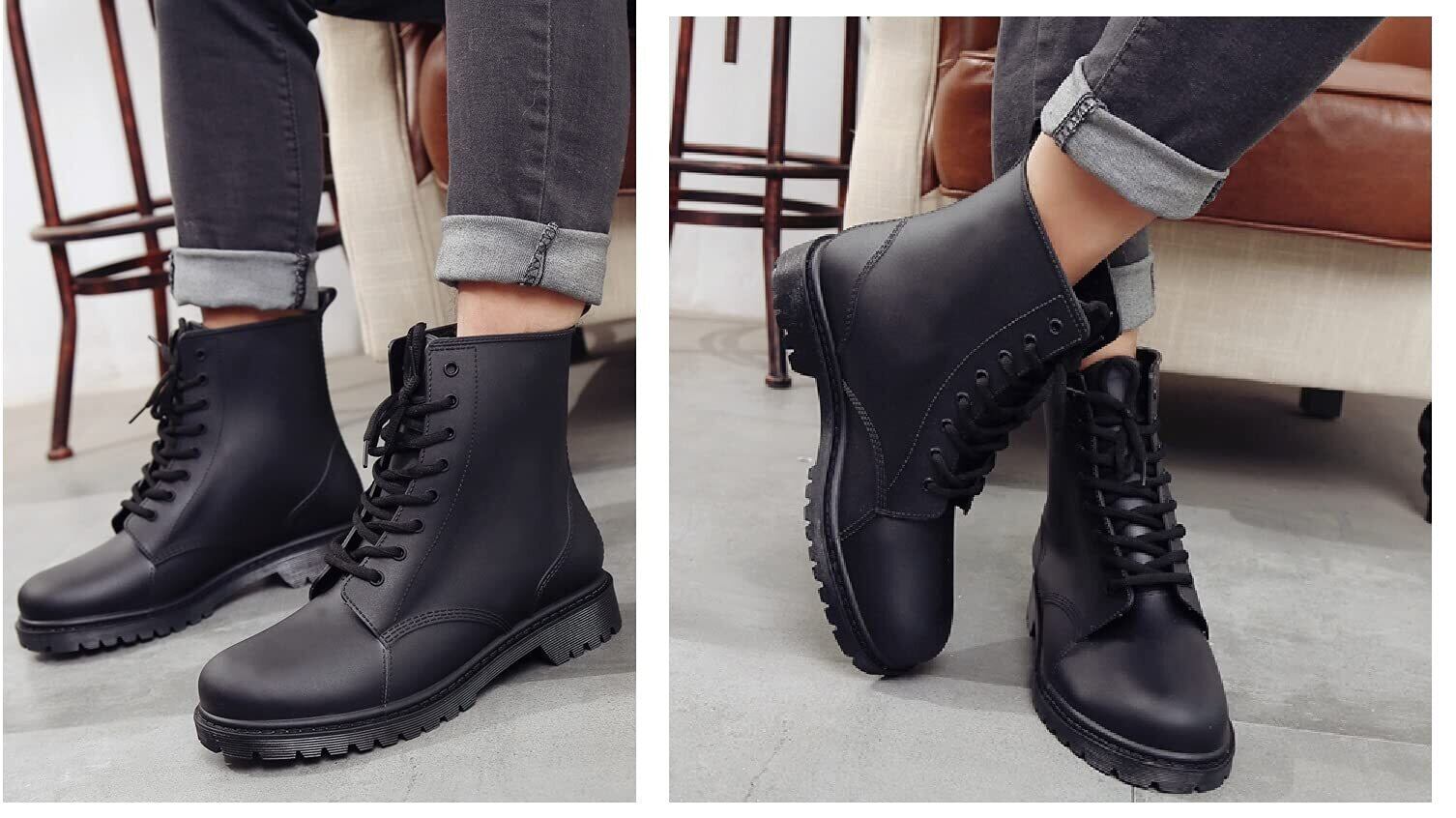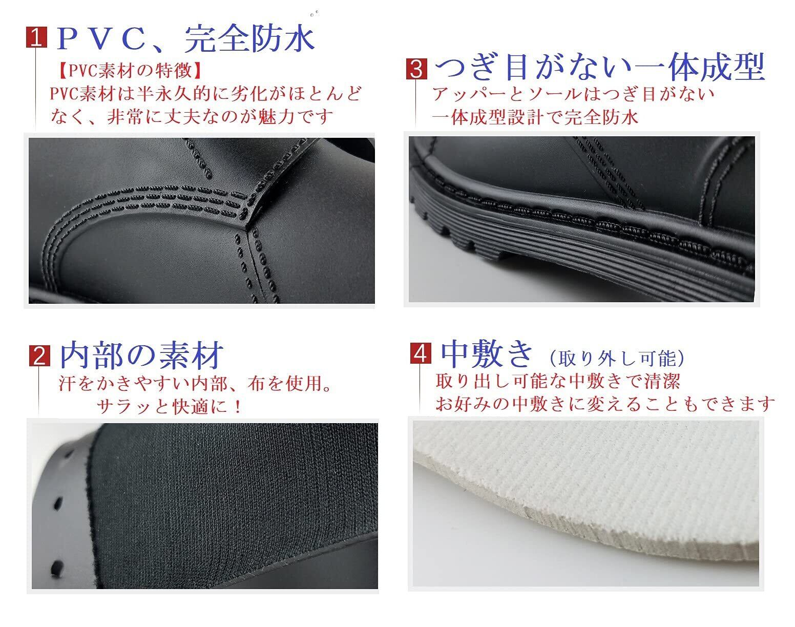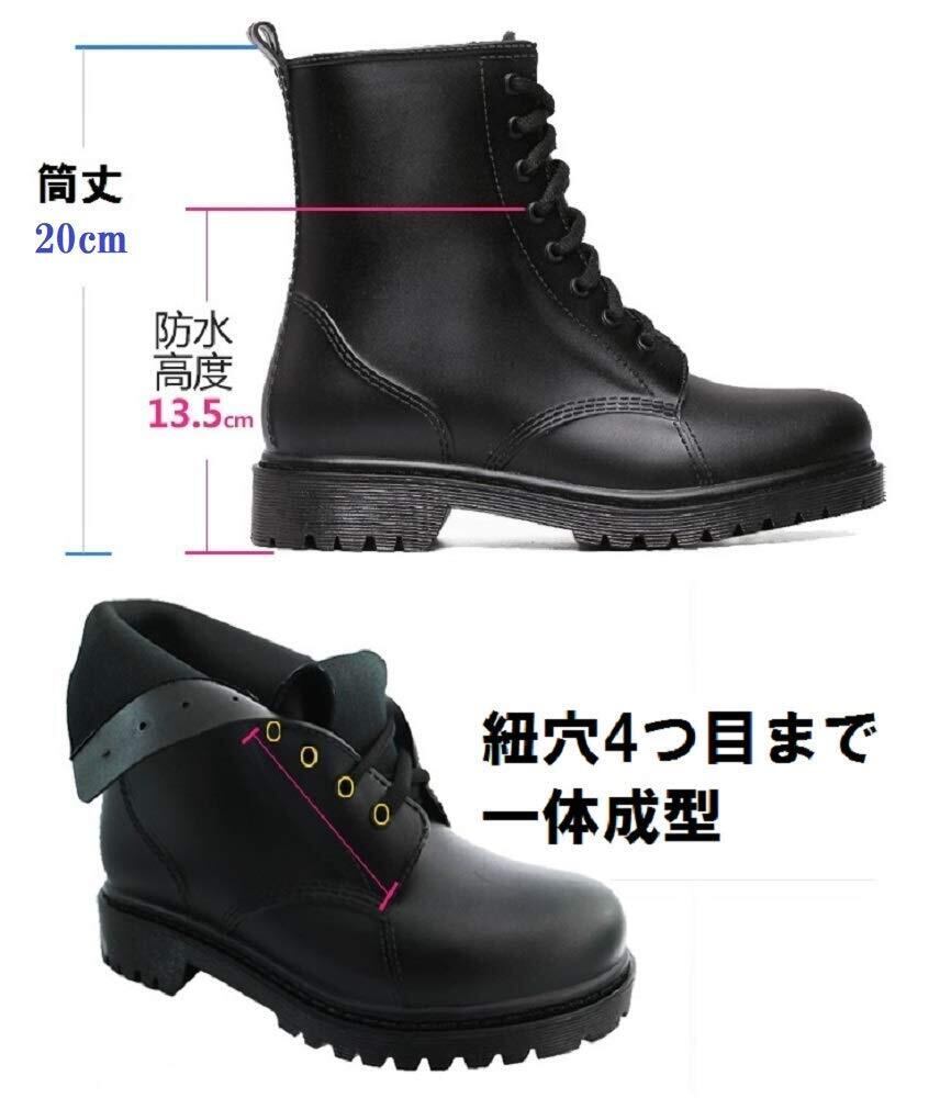 【防水高度】 ひも穴4つ目(地面より約13.5cm)まで一体成型で完全防水 足首より上の部分あたりまでしっかり防水 【ゆったり幅広】 日本人に多いとされる幅広タイプに合わせた設計。ゆったりとストレスを感じずに履きたい方にオススメ。いかに履きやすく作るかをテーマに考えられたレインシューズ