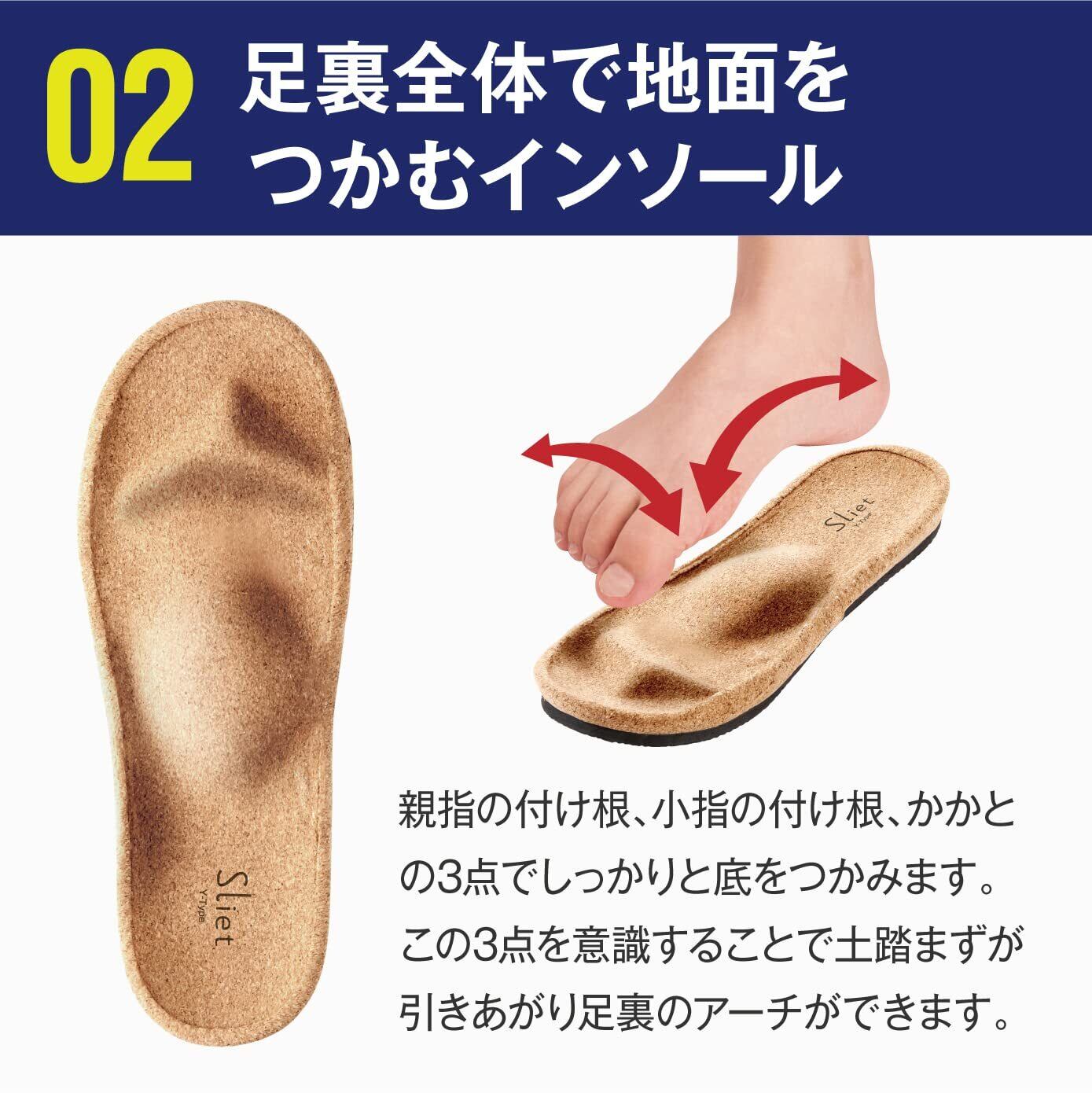 独自の傾斜ソールと中敷きで足裏全体で地面を支えて、履くだけでピンッ。