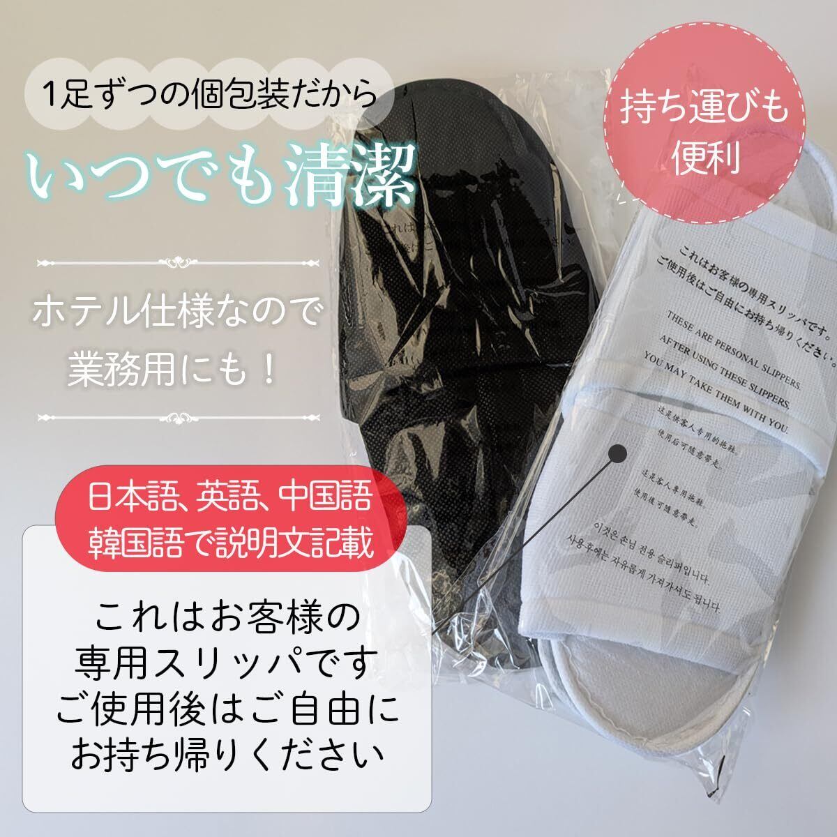 品質と価格を追求したホテル仕様の使い捨てスリッパ。個包装だからいつも清潔。業務用として、来客用スリッパとして、機内用スリッパとして幅広い用途にお使いいただけます。