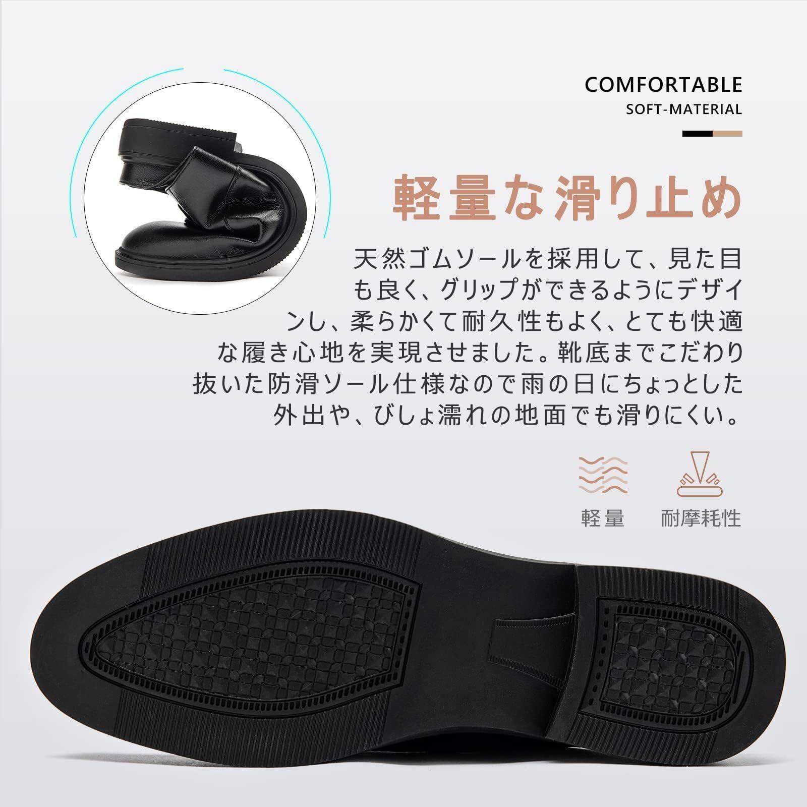 【独自機能が解決するビジネスパーソンの課題】静音&滑り止めソール:オフィスや会議室でも音を立てず、雨の日の社内外移動も安心天然ゴムソールを採用して、見た目も良く、グリップができるようにデザインし、柔らかくて耐久性もよく、 とても快適な履き心地を実現させました。靴底までこだわり抜いた防滑ソール仕様なので雨の日にちょっとした外出や、びしょ濡れの地面でも滑りにくい。