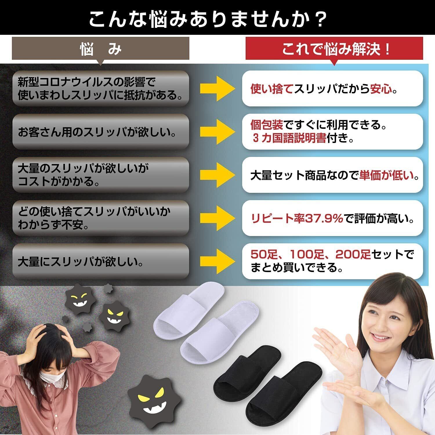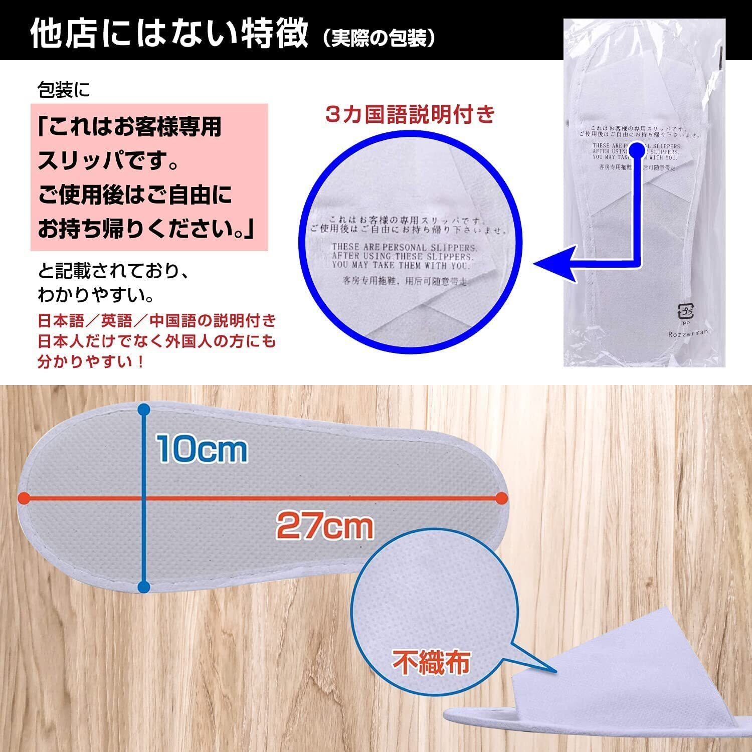 保管に便利な個包装】 ビニール包装で1足ずつ丁寧に個包装されており、常に衛生的な状態で保管することが可能。表面には日本語、英語、中国語の3か国語で使い捨てスリッパについての説明が記載されているため、海外からのお客様にもしっかり対応します。