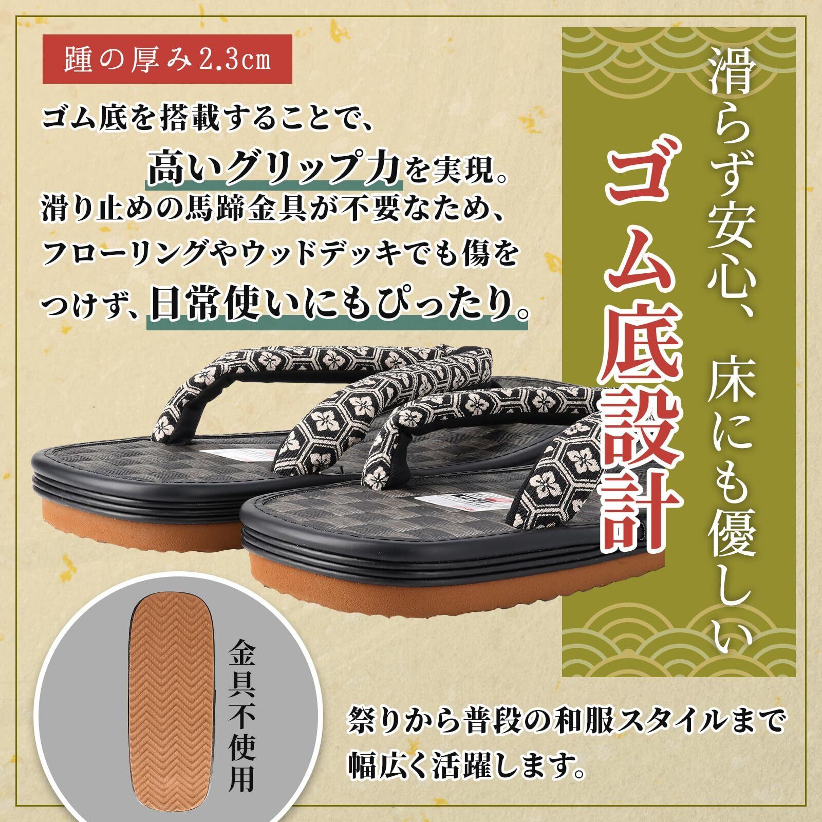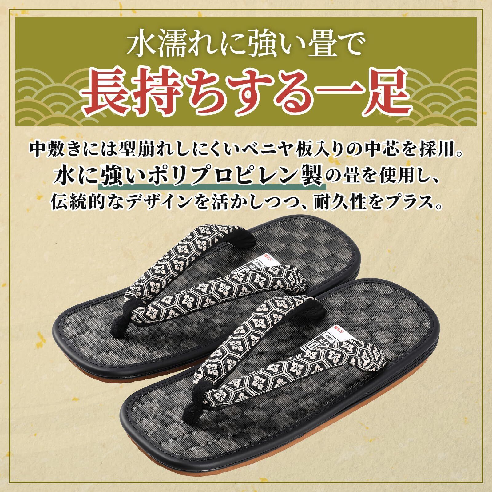【昔ながらの作り!型崩れしにくい中敷き】しっかりとした作りが魅力の「市松柄 本格雪駄」。中芯にはベニヤ板を使用し、伝統的な製法で型崩れしにくい設計に。さらに、水に強いポリプロピレン製の畳表を採用し、湿気や汚れにも強い仕様になっています。昔ながらの履物の良さを残しつつ、現代のライフスタイルにもマッチする使いやすさを追求しました。