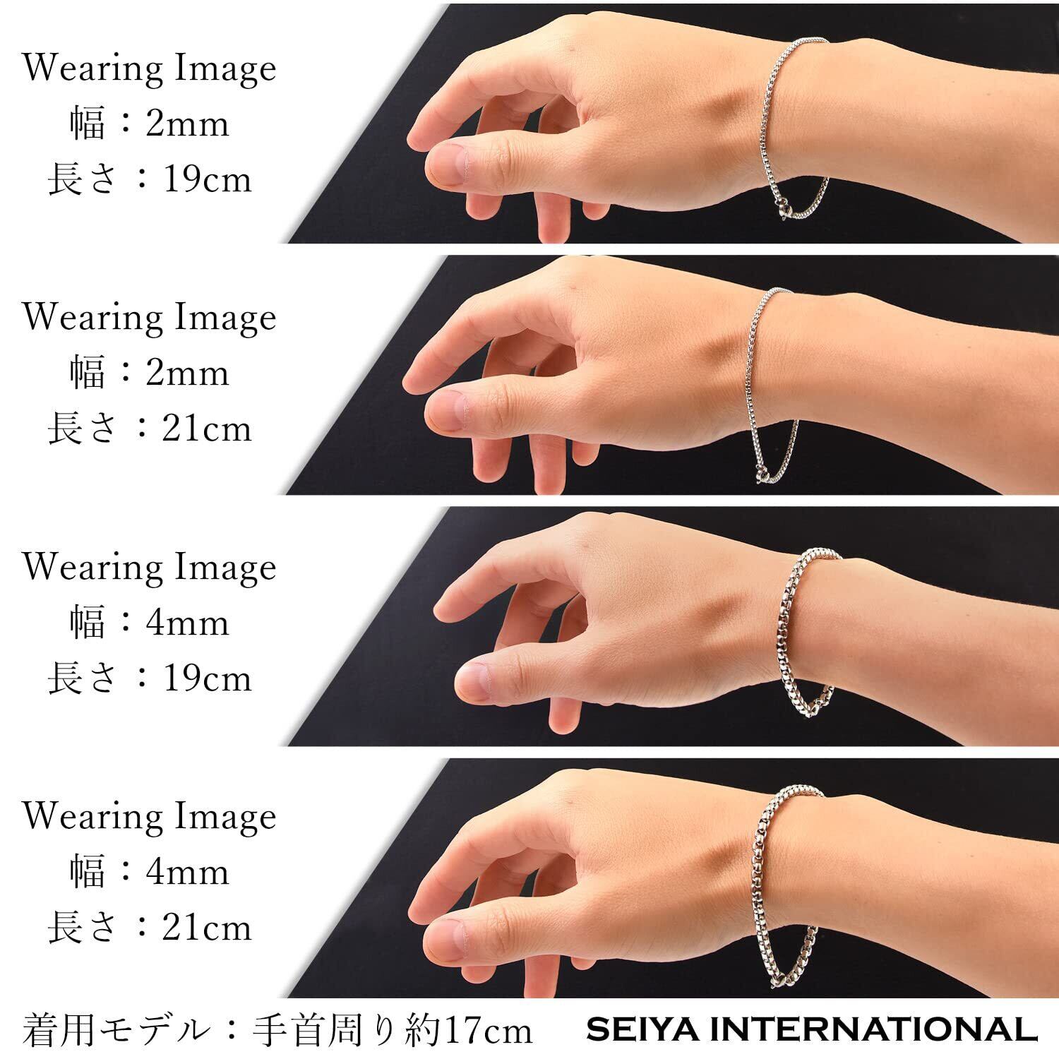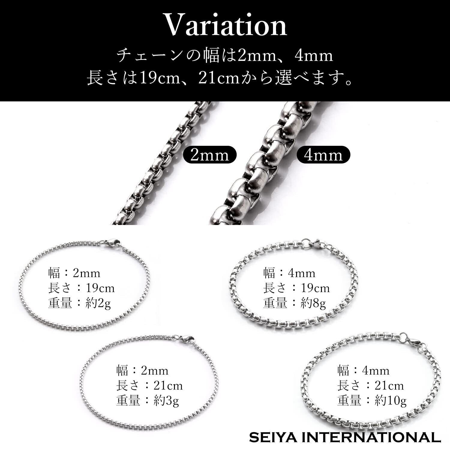 【 豊富なバリエーション 】チェーン幅2mm、4mm、チェーンの長さ19cm、21cmのそれぞれ計4種類ご用意しております。一般的な男性の手首周りのサイズは平均17センチ、女性は平均15センチで、チェーンブレスレットの場合は、手首周りプラス2~4センチぐらいがぴったり過ぎず、ちょうどいいサイズと言われています。シンプルな細めのチェーンタイプから存在感がある太めのチェーン幅と長さを選べるため、きっとあなたのお気に入りの商品が見つかるはずです。2つ、3つと重ねて着けたり、ぴったりめやゆったりめなどお好みのスタイルで楽しめるチェーンブレスレットです。