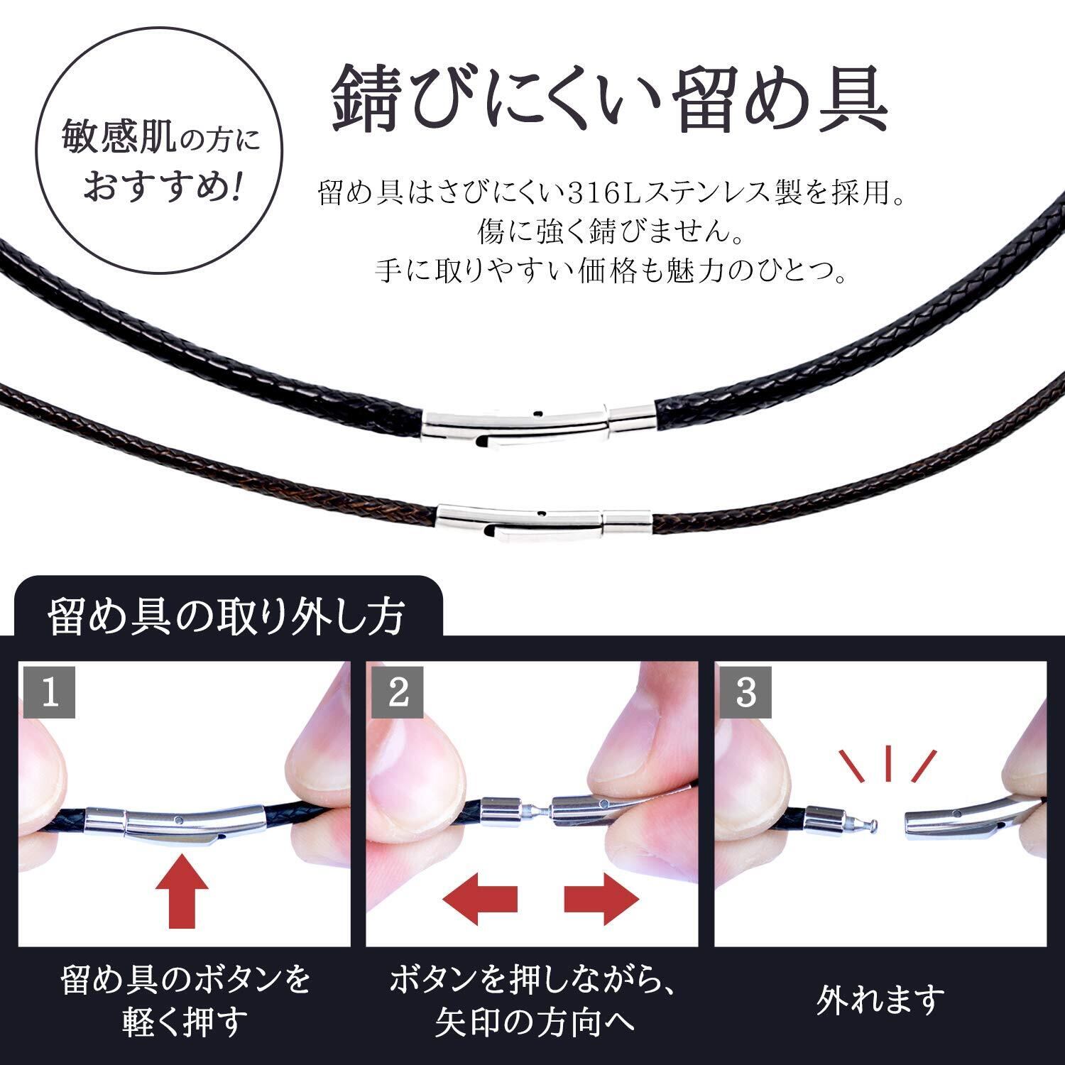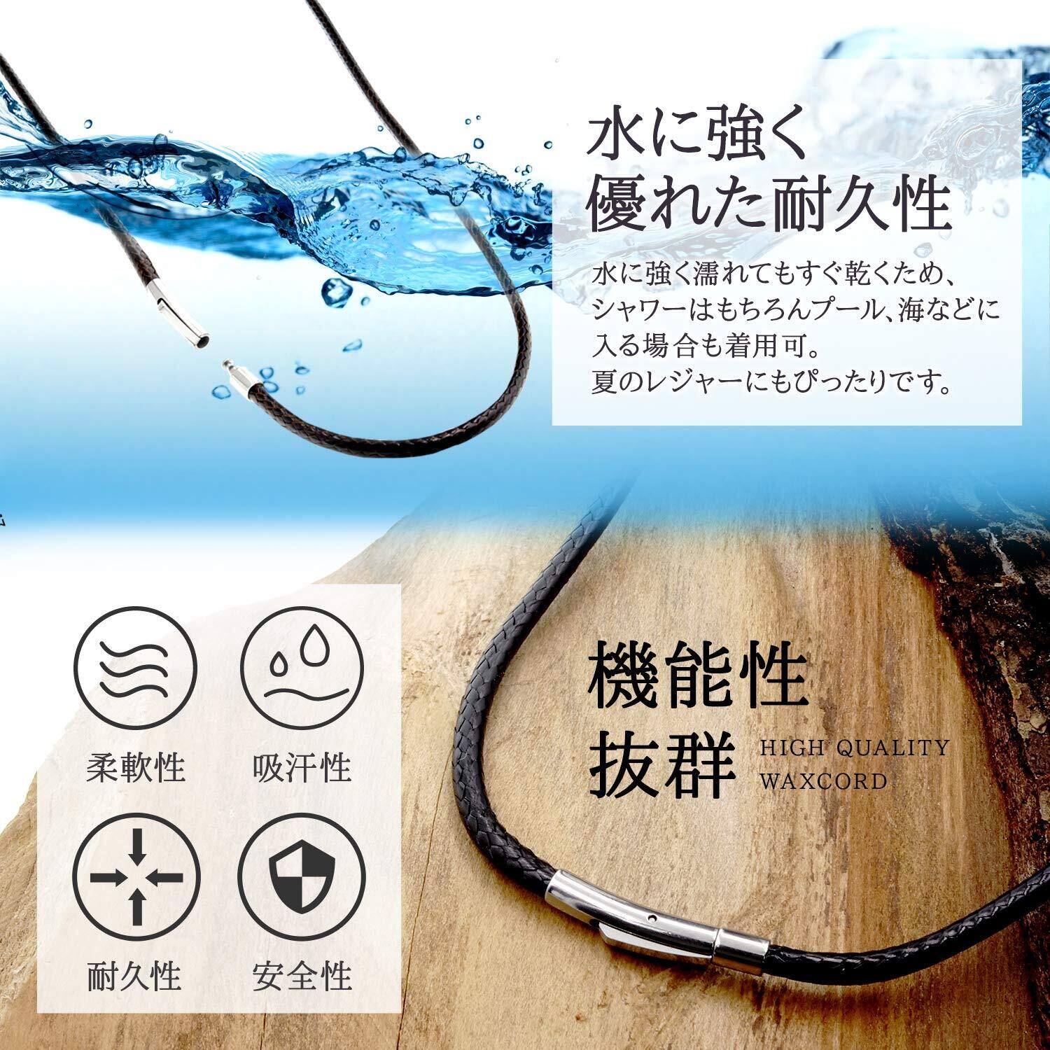 【高品質なワックスコード】着け外しも簡単なワンタッチプッシュ式。ポリエステルマイクロファイバーワックスコードは肌触りがよく、しなやかさと強度を合わせ持っています。紐も金具も耐水性ですので濡れても大丈夫です。お風呂でもプールでも着けたままで入っていただけます。