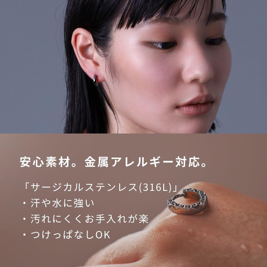 【金属アレルギー対応】サージカルステンレス(316L)。 金属アレルギー対応。金属アレルギーの方でも使用していただけるので、自分用だけでなくプレゼントとしても安心してお選びいただけます。水や汗にも強く錆びにくく、変色もしにくいのでお手入れの手間もほとんどかかりません。 海や温泉などのシーンでもつけっぱなしOKのタフな素材です。 非常に硬い金属なのでピアスポストが曲がりにくく、外れにくいのも特徴です。