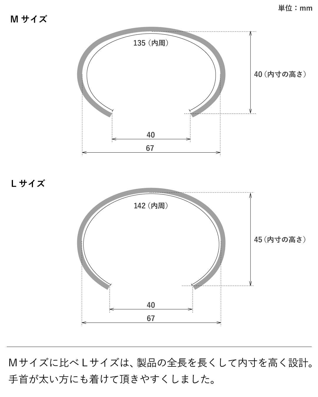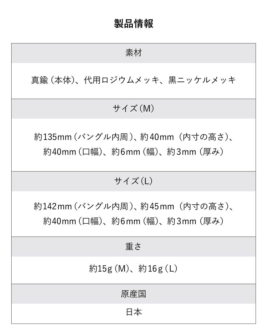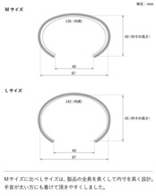 【サイズ(M)】:内径 約135㎜ / 口幅 約40㎜ / 幅:約6㎜ / 厚み:約3㎜ / 重さ:約15g 【サイズ(L)】:内径 約142㎜ / 口幅 約40㎜ / 幅:約6㎜ / 厚み:約3㎜ / 重さ:約16g