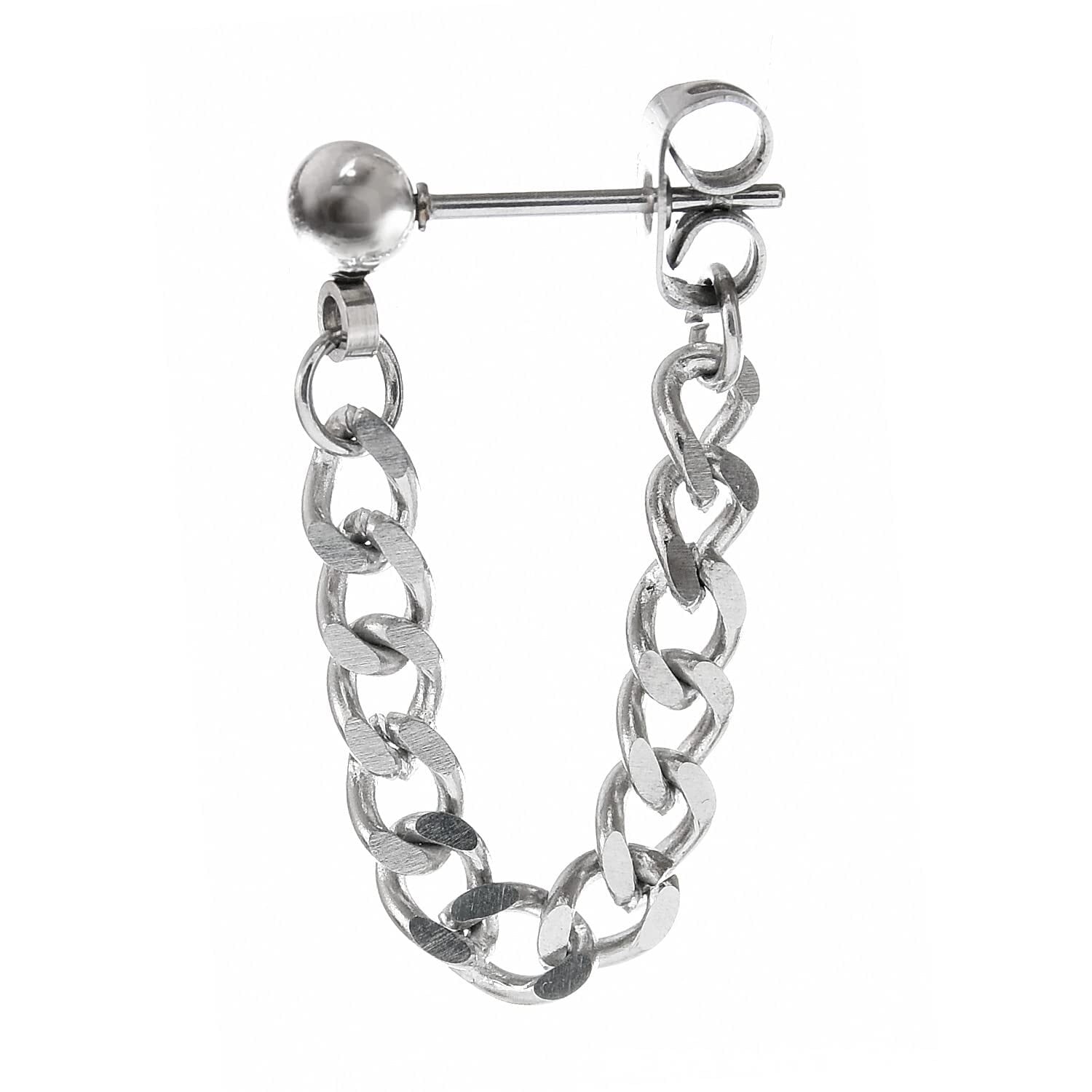 【 人気のチェーンピアス 】シンプルなボールピアスとキャッチをチェーンでつなげたバックキャッチピアス。耳元で揺れるチェーンピアスは日本はもちろん韓国などでも人気があり、定番のデザインです。前後のピアスをチェーンでつなぐことで耳の側面にチェーンが見えておしゃれなチェーンピアスはメンズ、レディース問わずユニセックスで着用できます。通常の耳たぶだけでなく軟骨ヘリックスにもおすすめです。