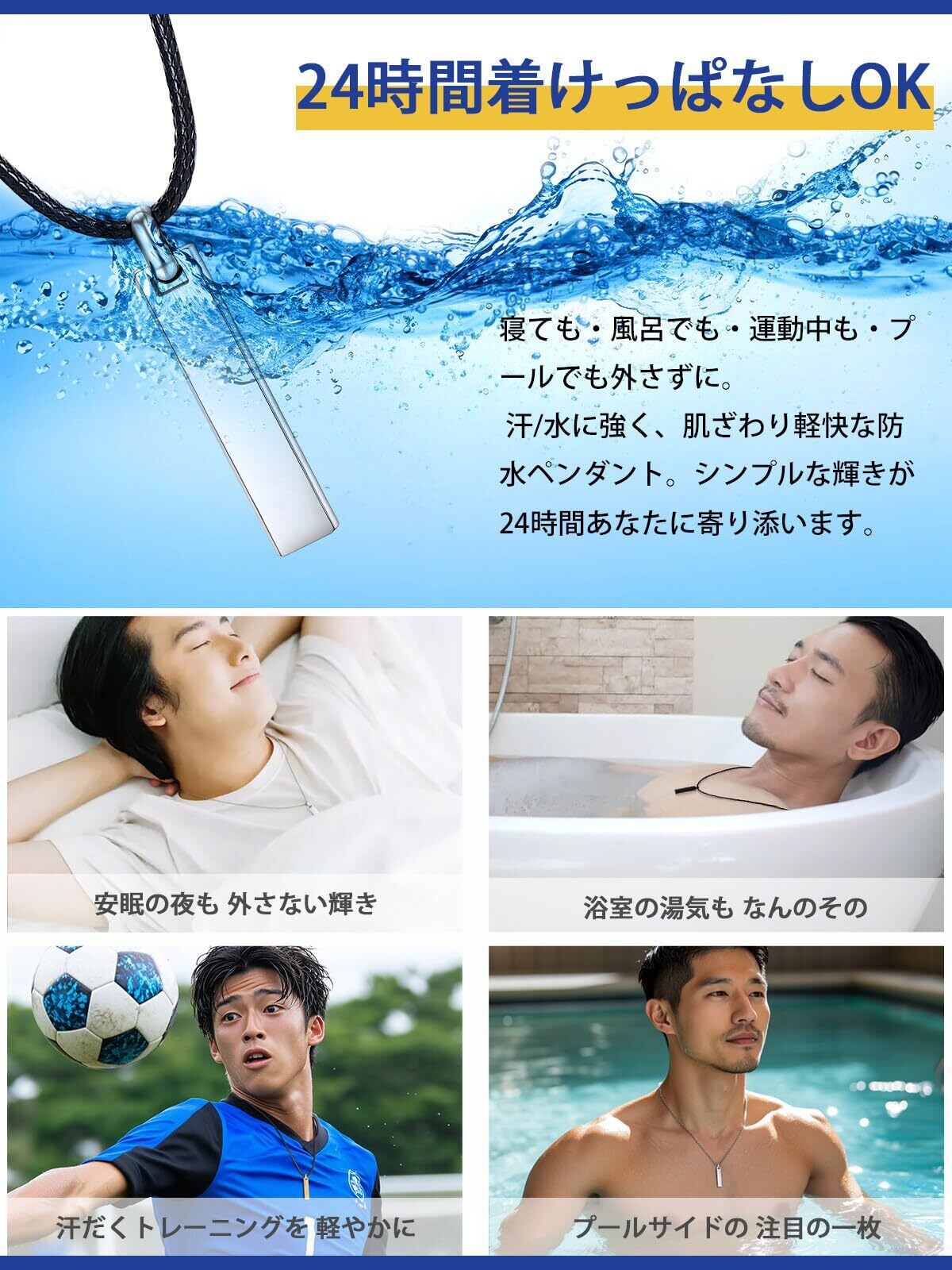 【日常生活に強い、ずっと身につけられる耐久性】 汗や水に強く、お風呂やプールでも付け外しの必要なし。面倒な手入れも不要で、いつでも清潔な状態を保てる高い耐水性が特長です。