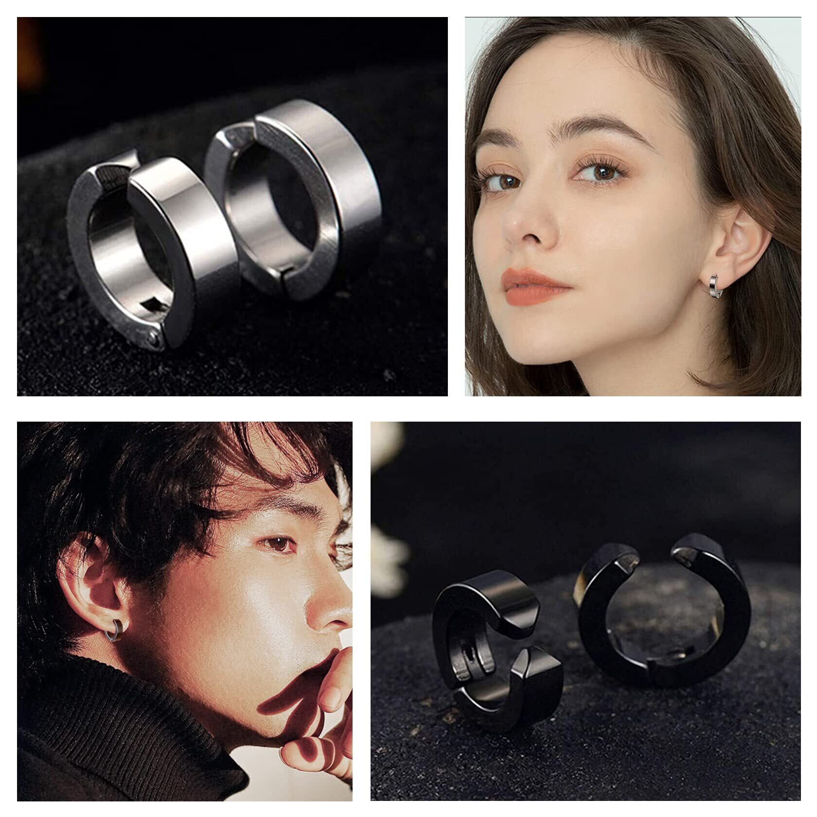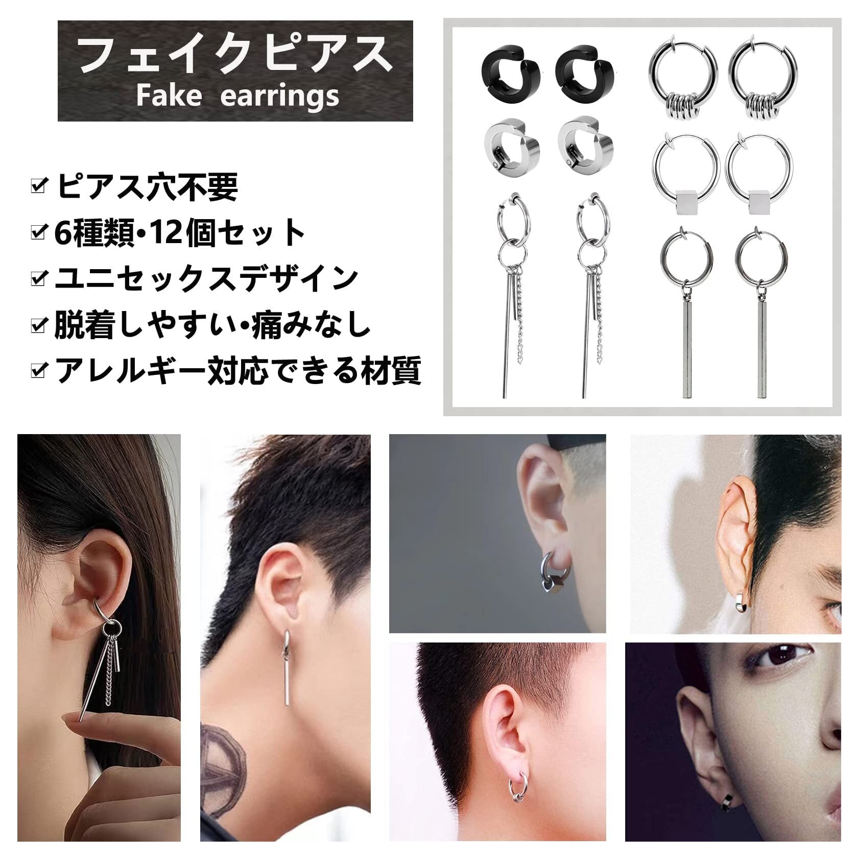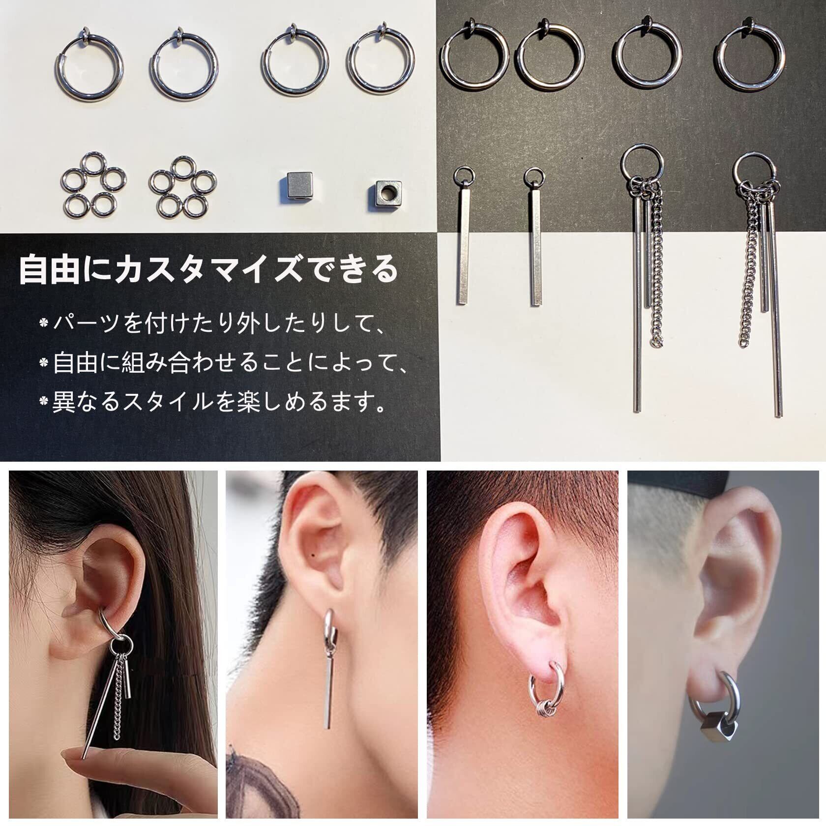 【お得な6ペア12個セット】セット内容:フェイクピアス6ペア、12個、収納ポーチ1個。ノンホールもオシャレに楽しめるフェイクピアス、イヤーカフ、イヤリング、ノンホールピアスです。イヤリングのパーツは付けた、外したりできるし、リングとパーツのサイズも違いますから、自由に組み合わせることによって異なるスタイルを楽しめます。イヤリングをペアでつけたり、片耳だけで付けたり、重ね付けたり、ブラックととシルバー色違いで付けたりし、イヤリングのパーツを外したら、フープピアス、イヤーカフ、軟骨ピアスなどとして10個以上の付け方法があります。