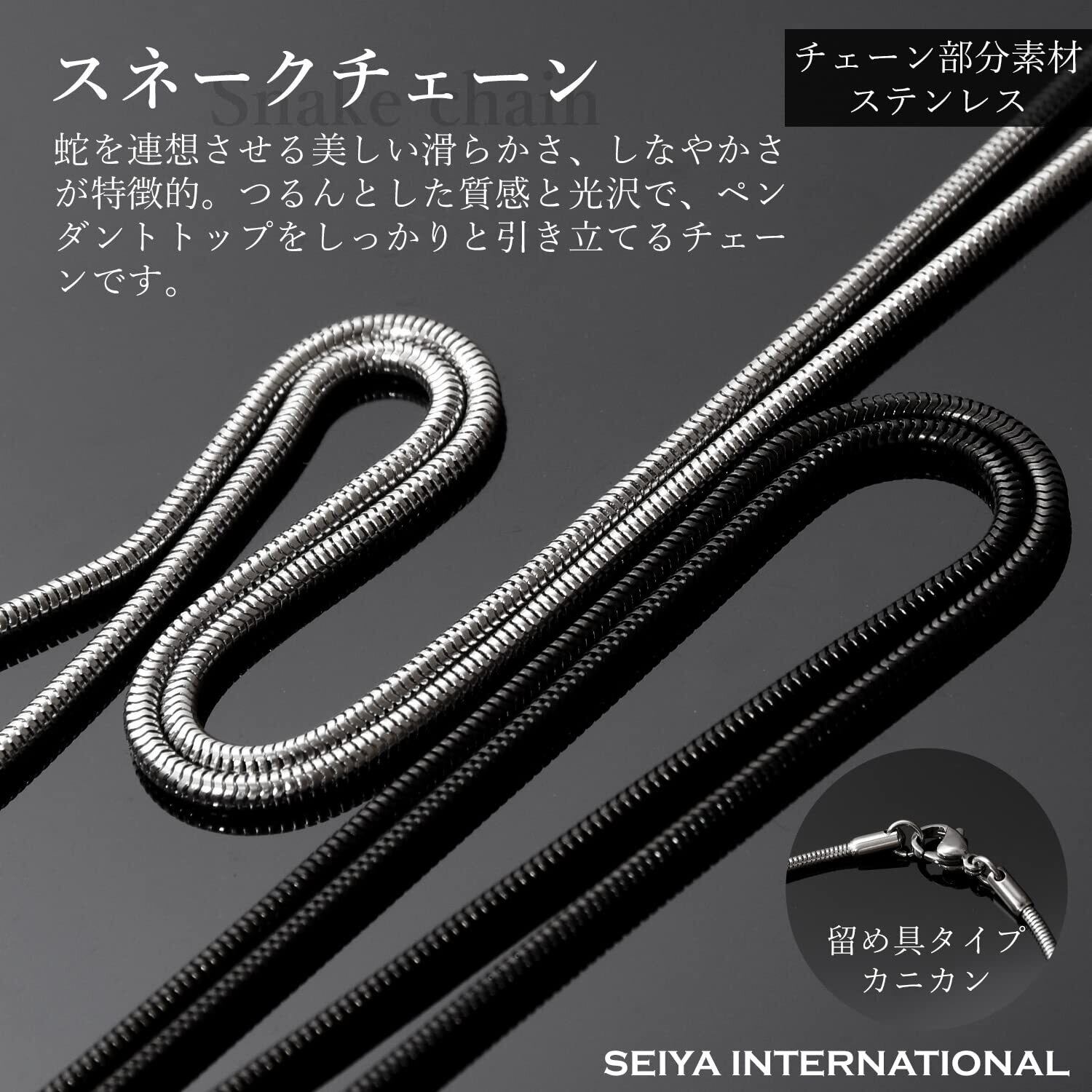 【 スネークチェーン 】蛇を連想させる美しい滑らかさ、しなやかさが特徴のスネークチェーン。つるんとした質感と光沢で肌に吸いつくようなしなやかさをもつチェーン。高級感があるタングステンペンダントをしっかりと引き立てるチェーンです。重量感があるペンダントがチェーンから抜けないようにペンダントからチェーンが抜けない加工を施しております。留め具は取り外しがしやすいカニカンでチェーン・留め具の材質はステンレスになります。ステンレスは金属の中でもアレルギー性が極めて低い素材です。耐食性がとても高いので水や汗によるサビ、変色に強いのでお風呂や海へ気にせずアクセサリーを着けたまま入ることができます。また、硬い金属なので傷がつきにくく、変形しにくいです。水にぬれた時も乾いたタオルでさっと拭くだけでお手入れも簡単です。