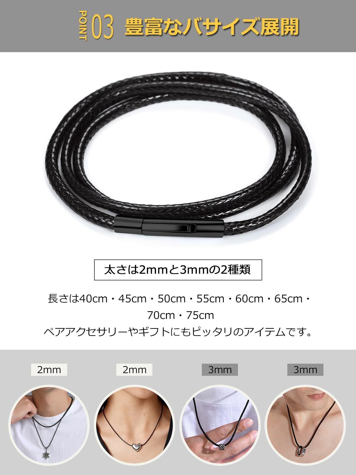 [豊富なバリエーション] サイズバリエーションが豊富なのも嬉しいポイント。太さは2mmと3mmの2種類、長さは40cm・45cm・50cm・55cm・60cm・65cm・70cm・75cmをご用意しました。