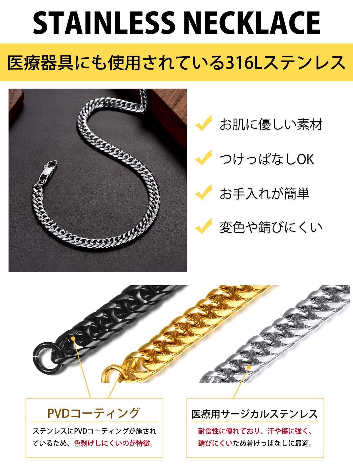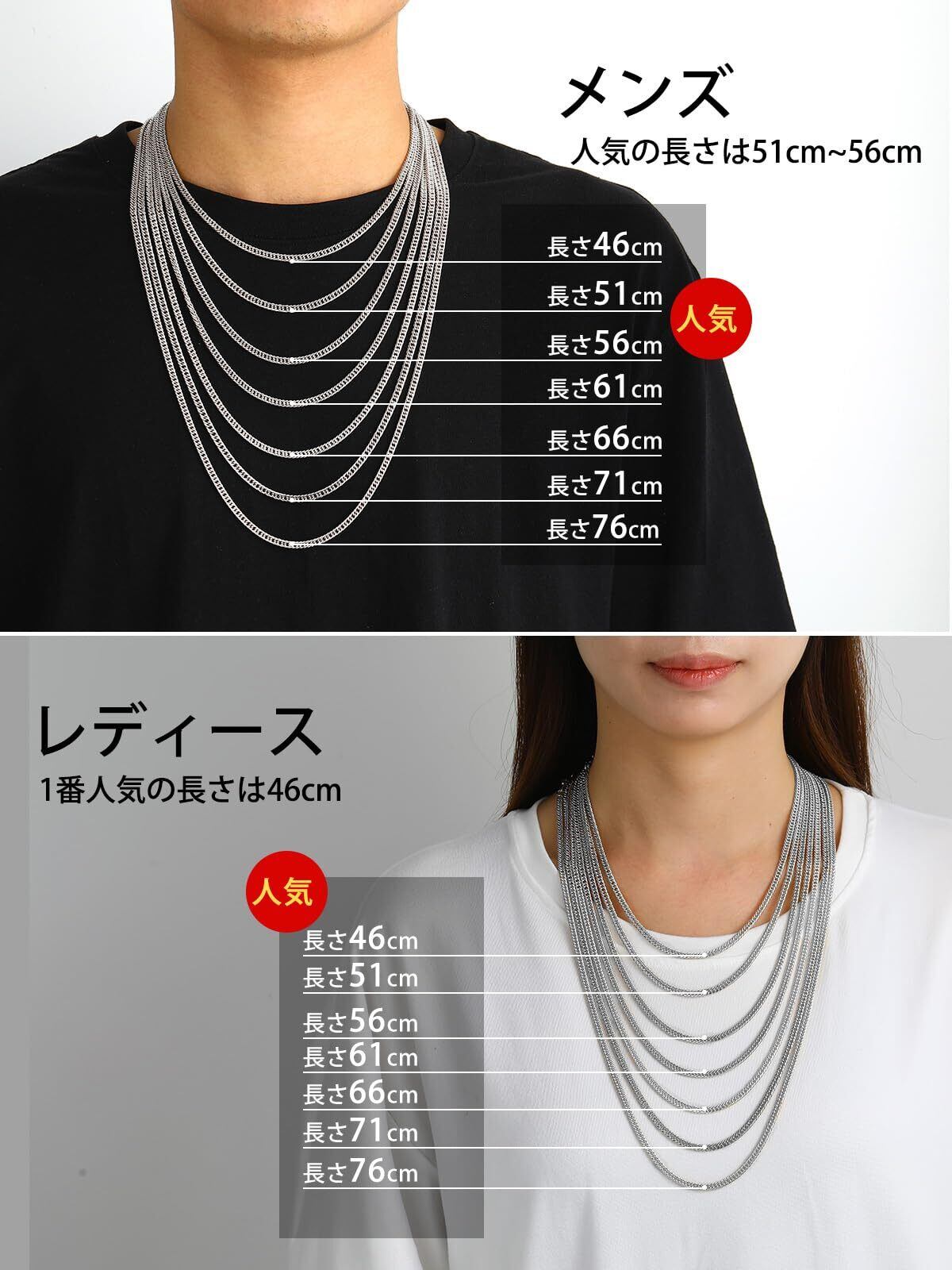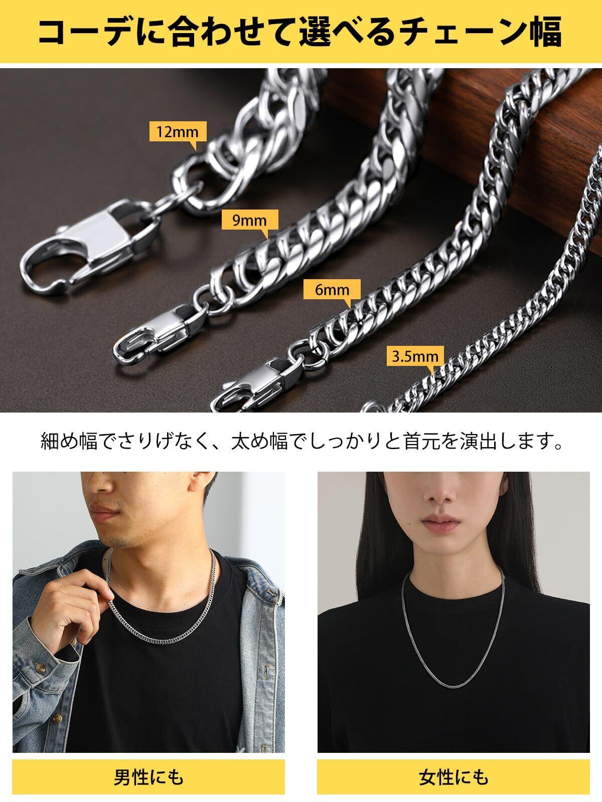 【色も!太さも!長さも選べる!】3.5mm、6mm、9mm、12mmの4太さ、シルバー、ゴールド、ブラックの3色、46cm、51cm、56cm、61cm、66cm、71cm、76cm、91cmの8長さ、全72種類を揃えました!