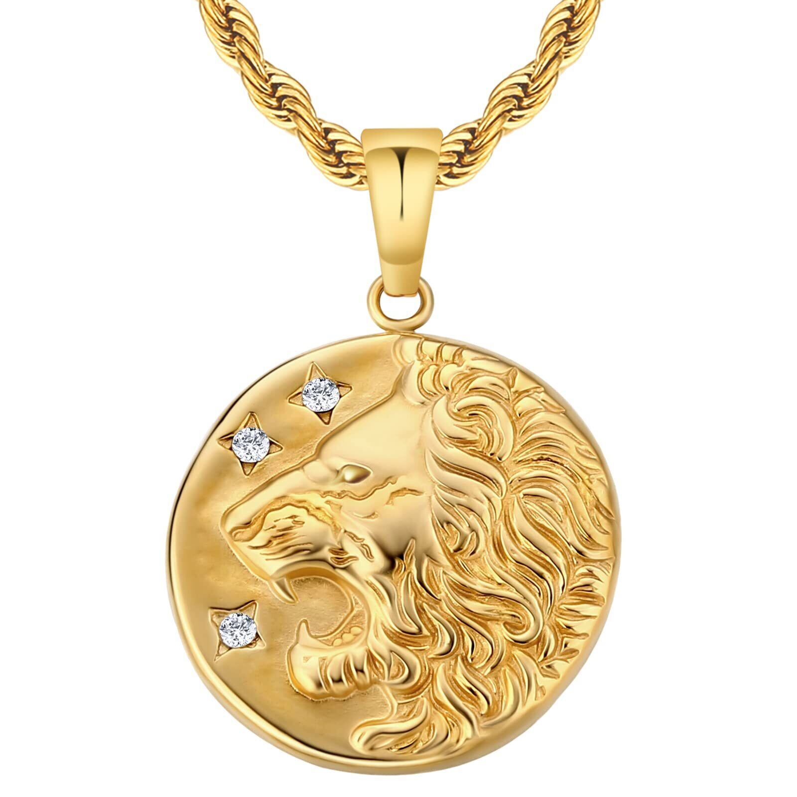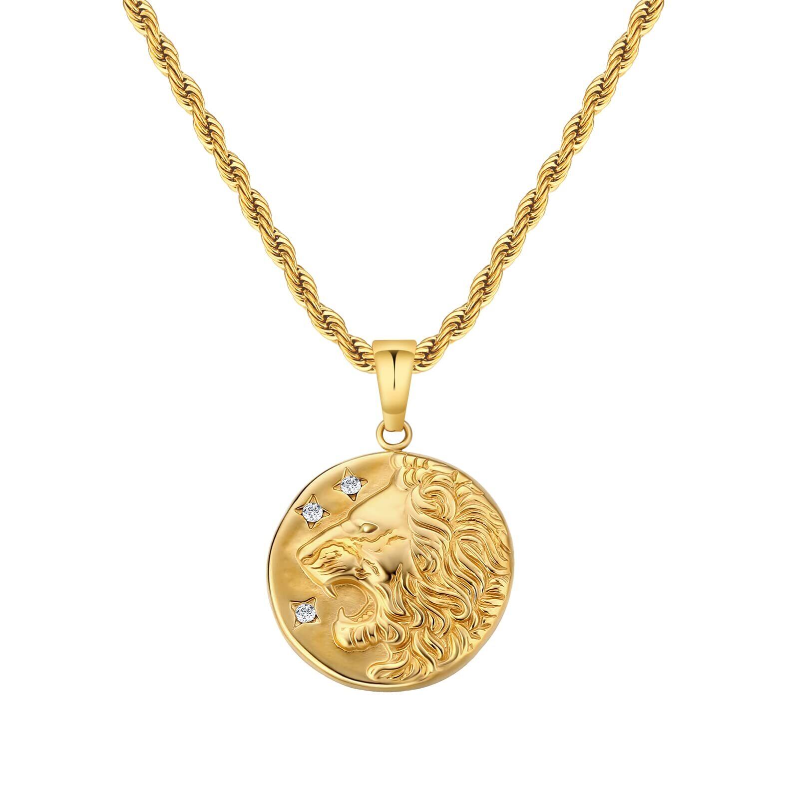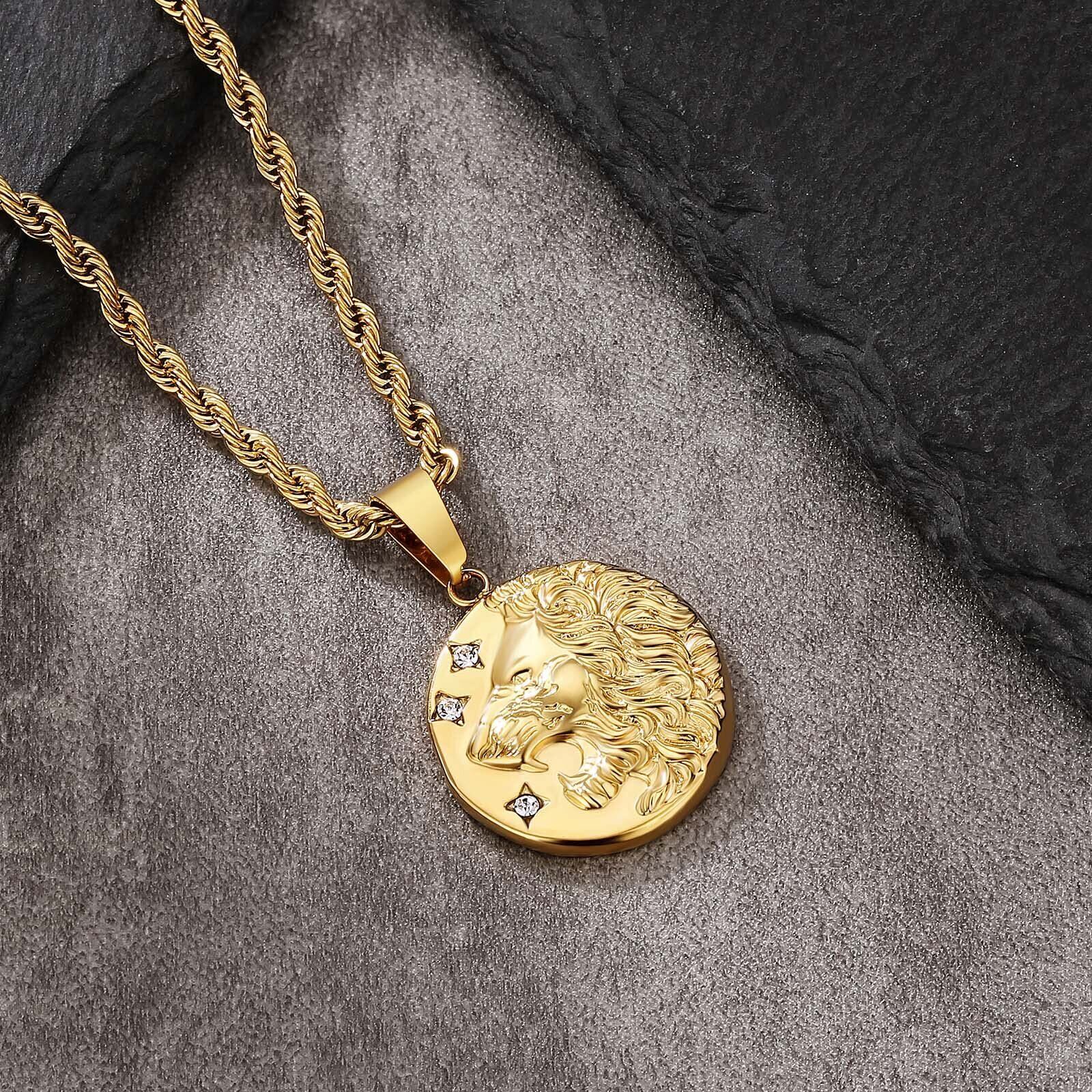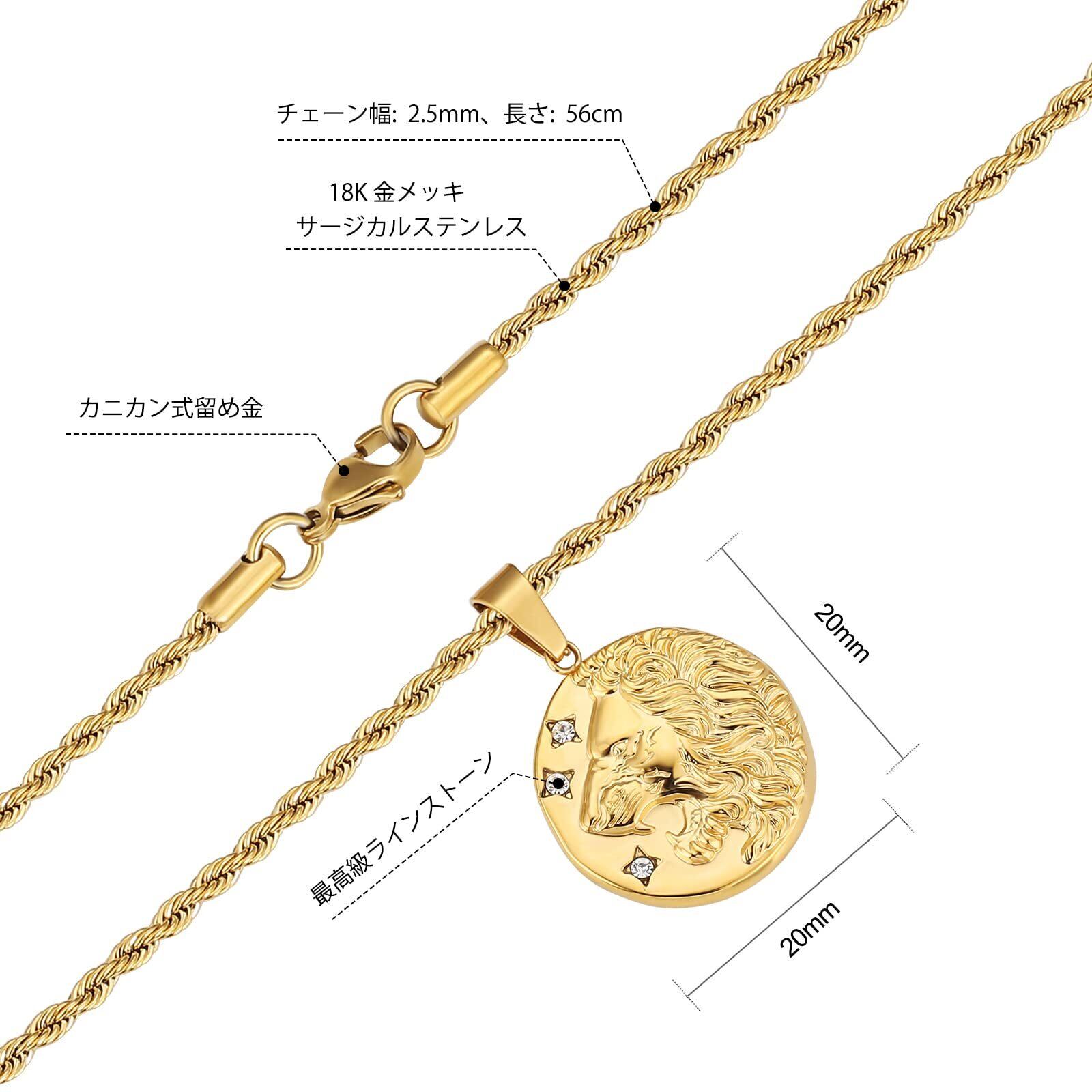 【商品仕様】商品名:ライオン ペンダントネックレス、チェーン種類:フレンチロープ、素材:サージカルステンレス+金メッキ、幅:2.5mm、ネックレスの長さ:56cm、カラー:18kゴールド、重量:15g。※トップとチェーンは取り外しが可能となっております。
