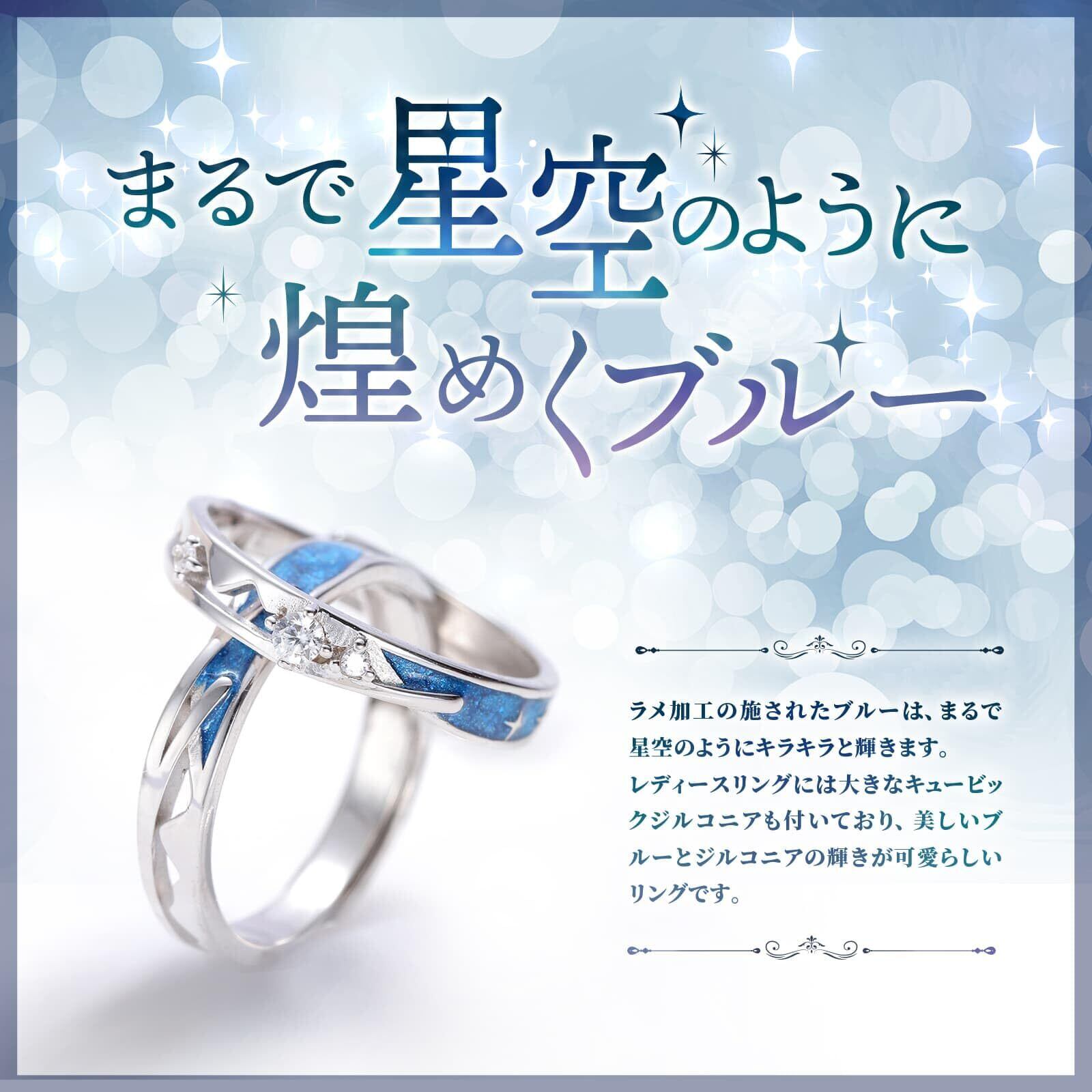 【 まるで星空 】 男性用、女性用ともに、星空を表したブルーが特徴的なペアリング。ただのブルーではなくラメ加工も施されているので、手元でキラキラと輝きます。