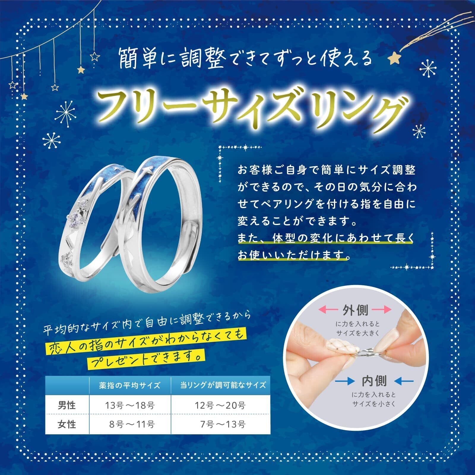 【 ずっと使えるフリーサイズ 】 お客様ご自身で簡単にサイズ調整ができるフリーサイズを採用。その日の気分に合わせて指輪をつける指を自由に変えることができます。また、体系の変化に合わせて長くお使いいただけます。リングの調整範囲は、男性リングは12号,13号,14号,15号,16号,17号,18号,19号,20号に調整可能、女性リングは7号,8号,9号,10号,11号,12号,13号に調整可能です。平均的な指のサイズを全てカバーしているため、恋人の指のサイズがわからなくてもプレゼントできます。