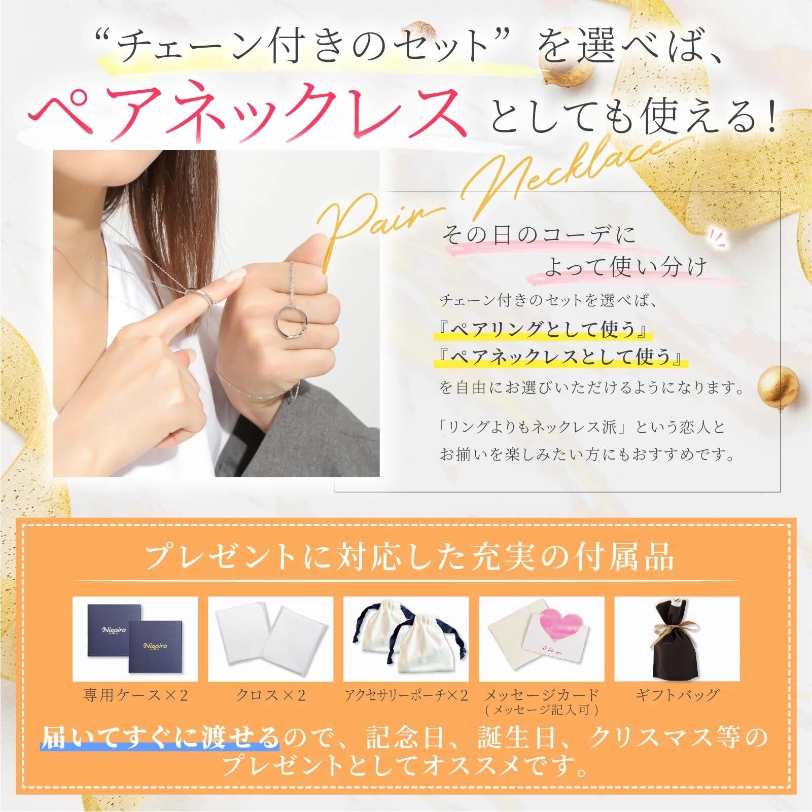 【 ペアネックレスとしても使える 】 チェーン付きセットを選べば、ペアリングをペアネックレスとしても使えるようになります!「リングよりもペアネックレス派」という恋人とおそろいを頼みしたいカップルにもおすすめです。