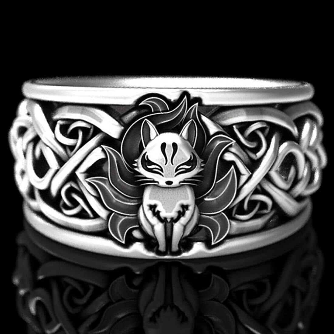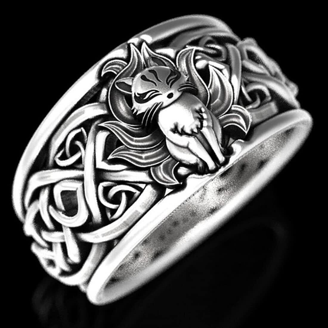【Rockyu リング】メンズ 九尾の狐指輪 シルバー ステンレス製 狐モチーフ 金属アレルギー対応 15号指輪。素材: ステンレス 幅: 10mm。