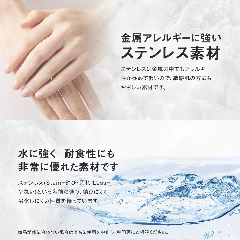 【金属アレルギー対応】ステンレスは金属の中でもアレルギー性が極めて低い素材です。 【お風呂、海OK】耐食性がとても高いので水や汗によるサビ、変色に強いのでお風呂や海へ気にせずアクセサリーを着けたまま入ることができます。 【お手入れ簡単】ステンレスは硬い金属なので傷がつきにくく、変形しにくです。また水にぬれた時も乾いたタオルでさっと拭くだけでOK