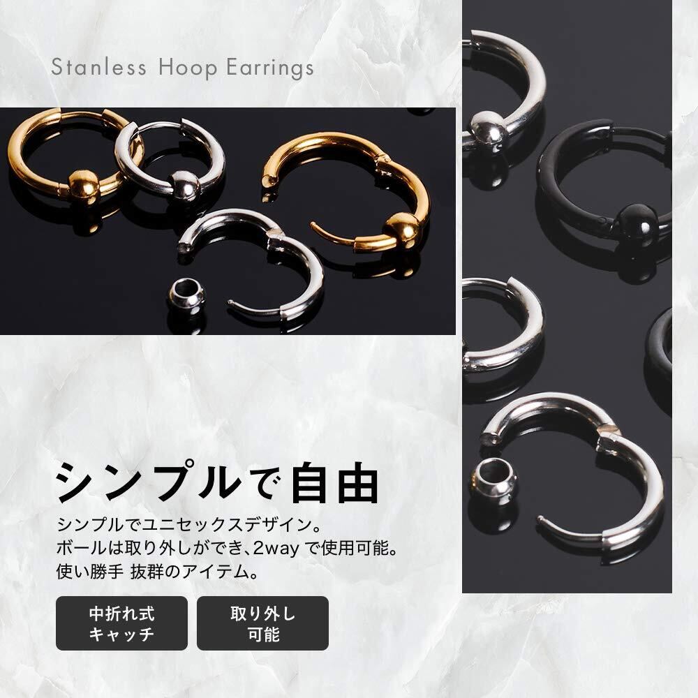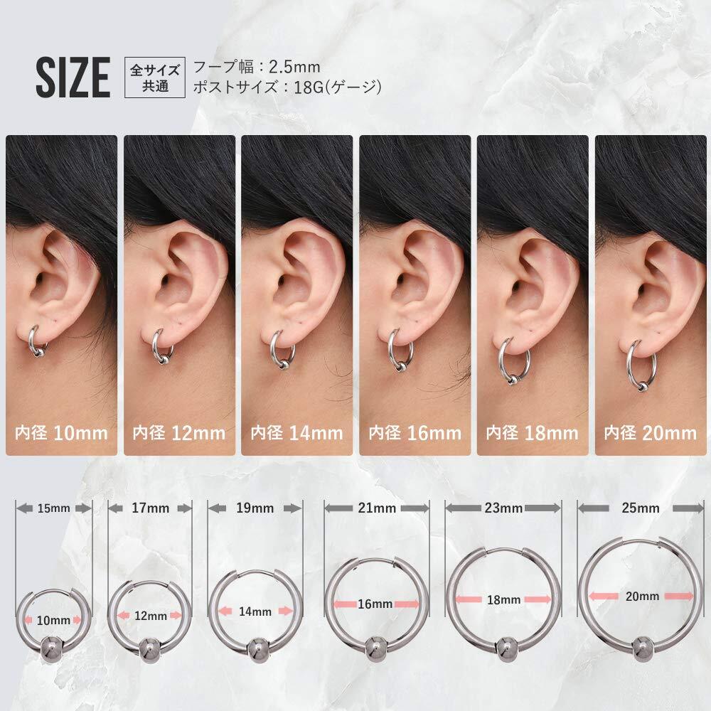 外径:19mm 内径:14mm リング幅:2.5mm ビーズ直径:6mm ピアスゲージ:18G ピアス重さ:2g/1個 素材:ステンレス