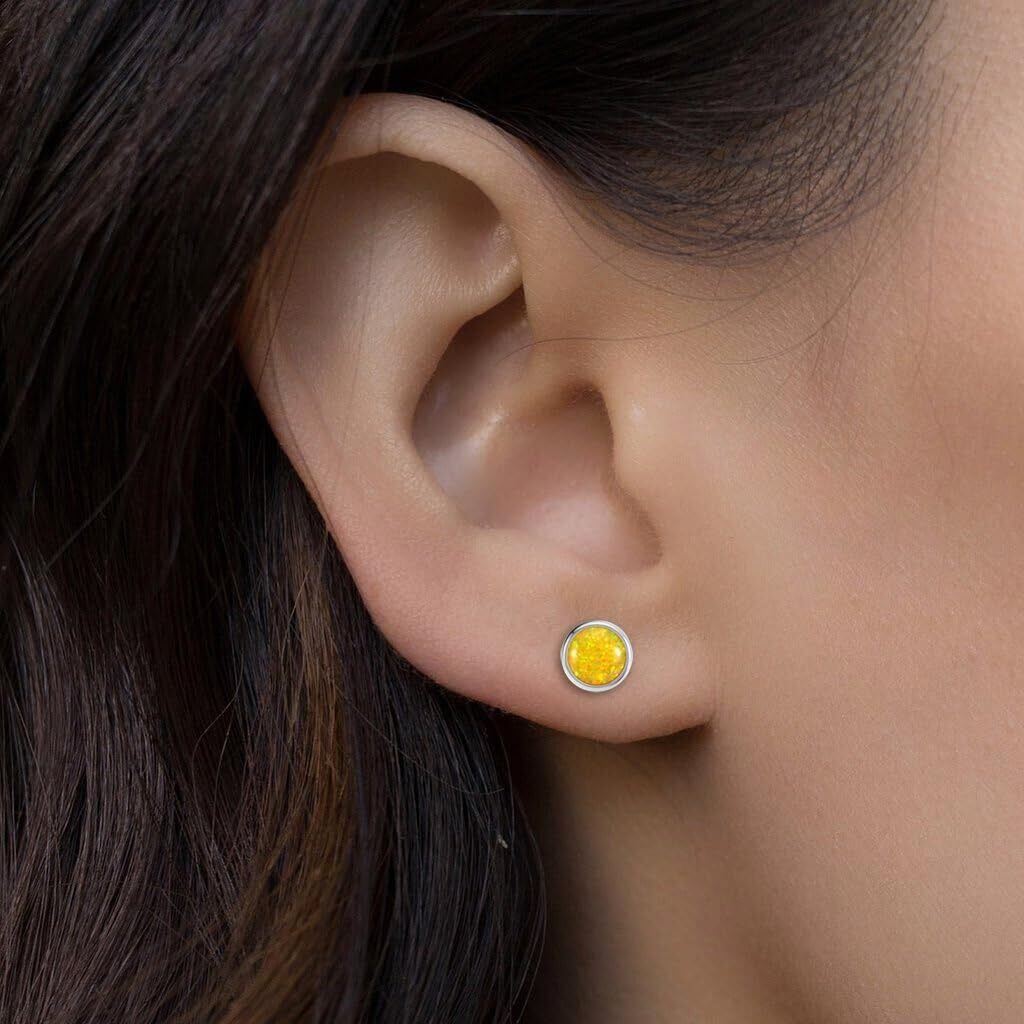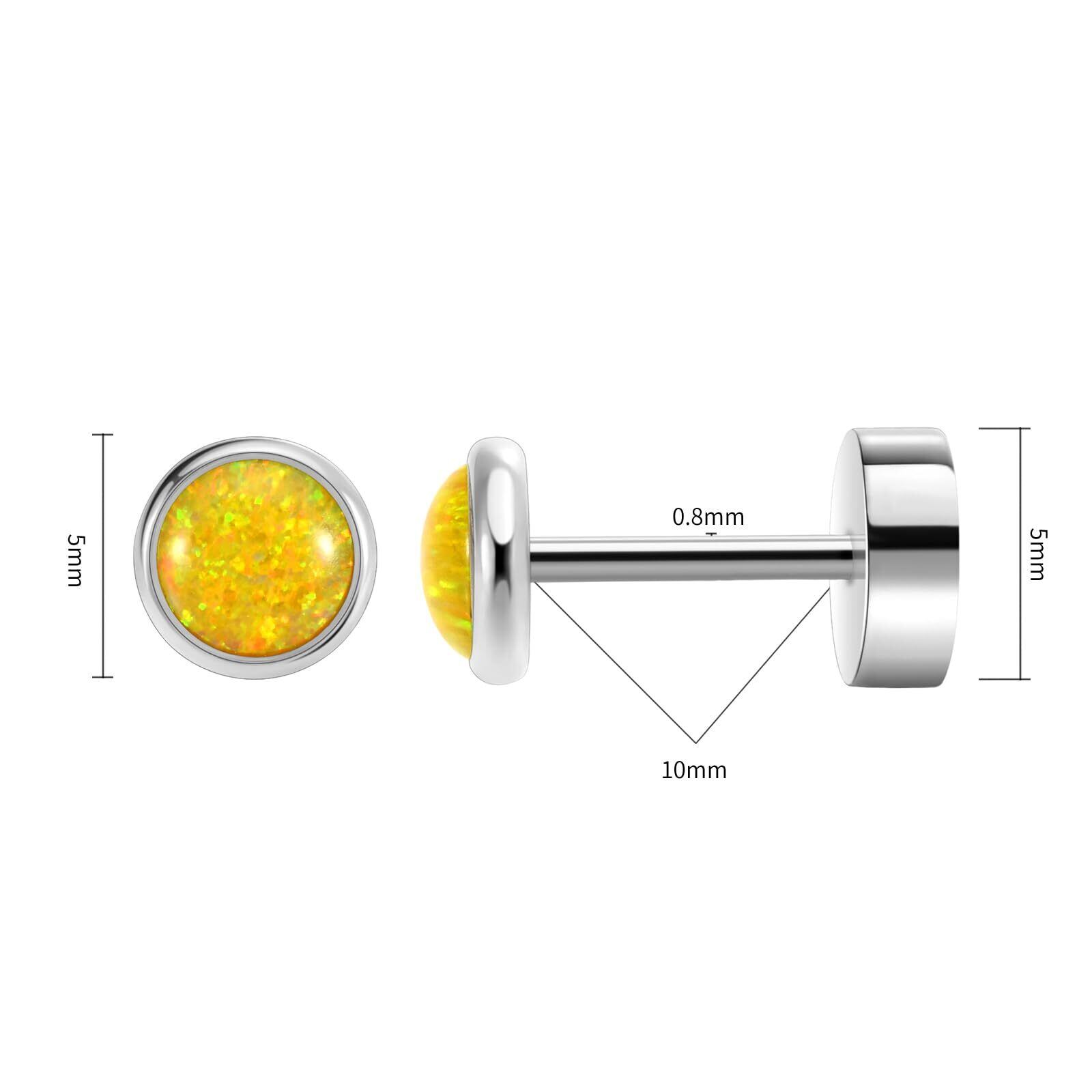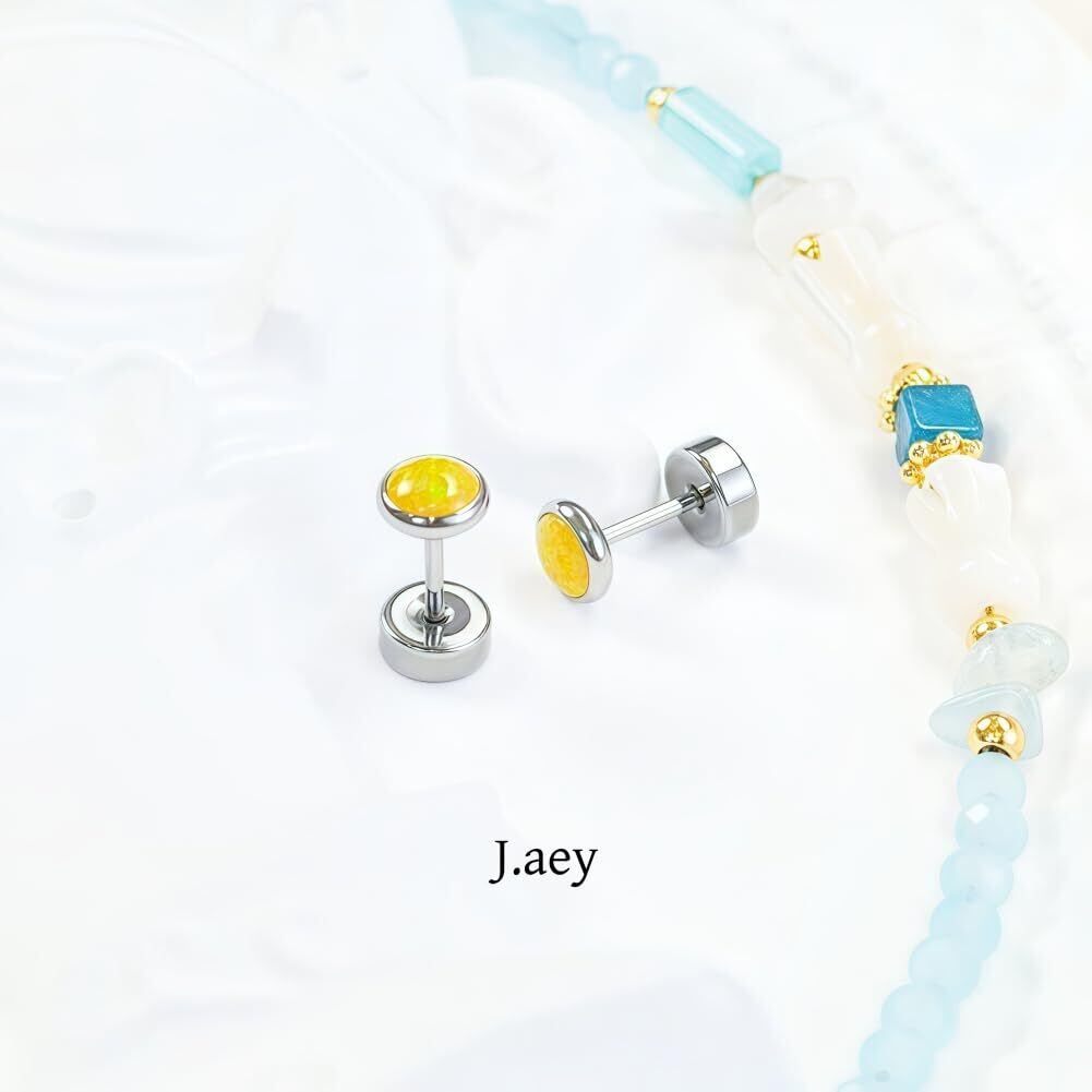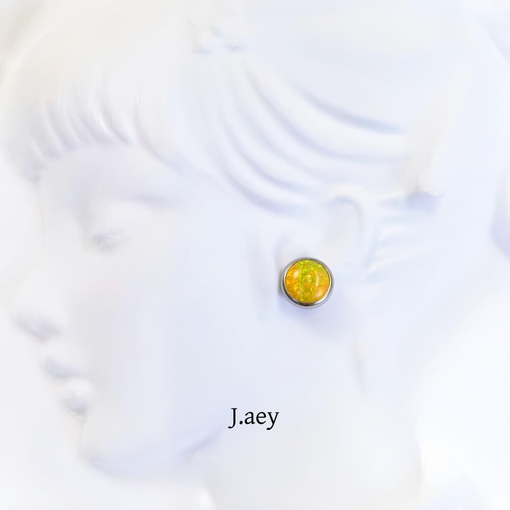 ✿ピアス シンプル 小さい。チタン製のベゼルセットインレイデザインで、イエローオパール石が落ちないように配慮しています。ピアスの人気要素を取り入れたデザイン。 シンプルな1粒5mmラウンドの高級イエローオパールのピアスは温かみを感じさせます。小さくても存在感のあるデザインのピアスです。