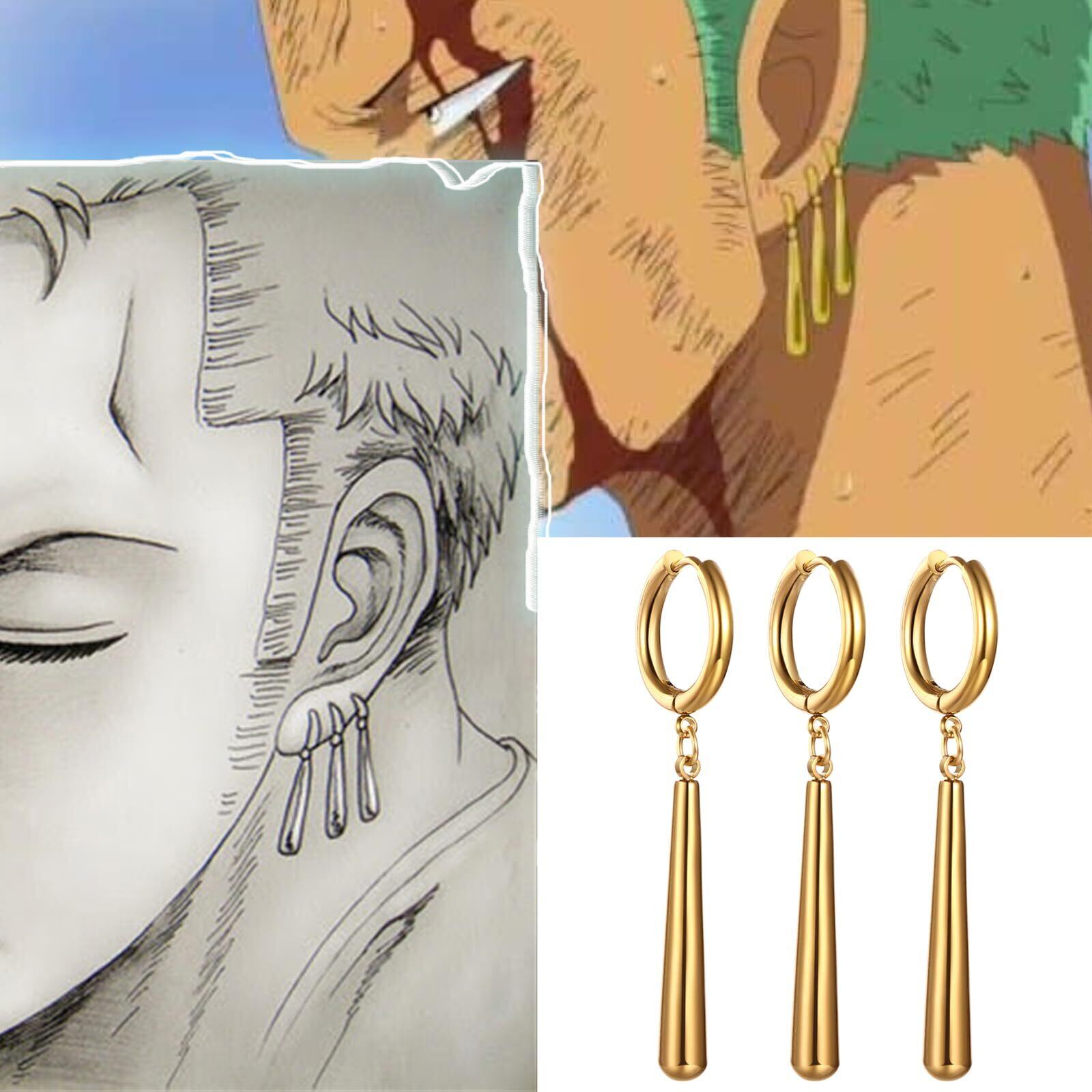 ロロノア・ゾロ イヤリング メンズ ピアス つけっぱなし: ワンピース 片耳 フープピアス リングピアス 海賊 アニメ コスプレ ステンレス アレルギー対応 3点セット 人気 耳飾り 周辺 アクセサリー ゴールド
