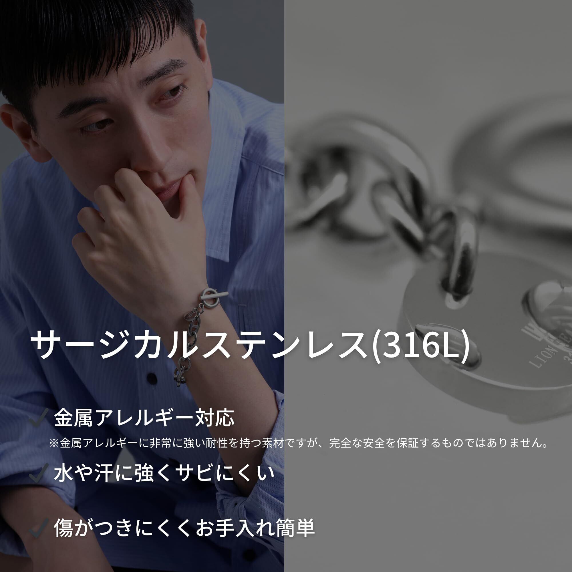 【金属アレルギー対応素材】サージカルステンレス(316L)。 金属アレルギー対応。水や汗による変色、変形が少なく、傷がつきにくいタフな素材。つけっぱなしOKで普段使いにピッタリ。