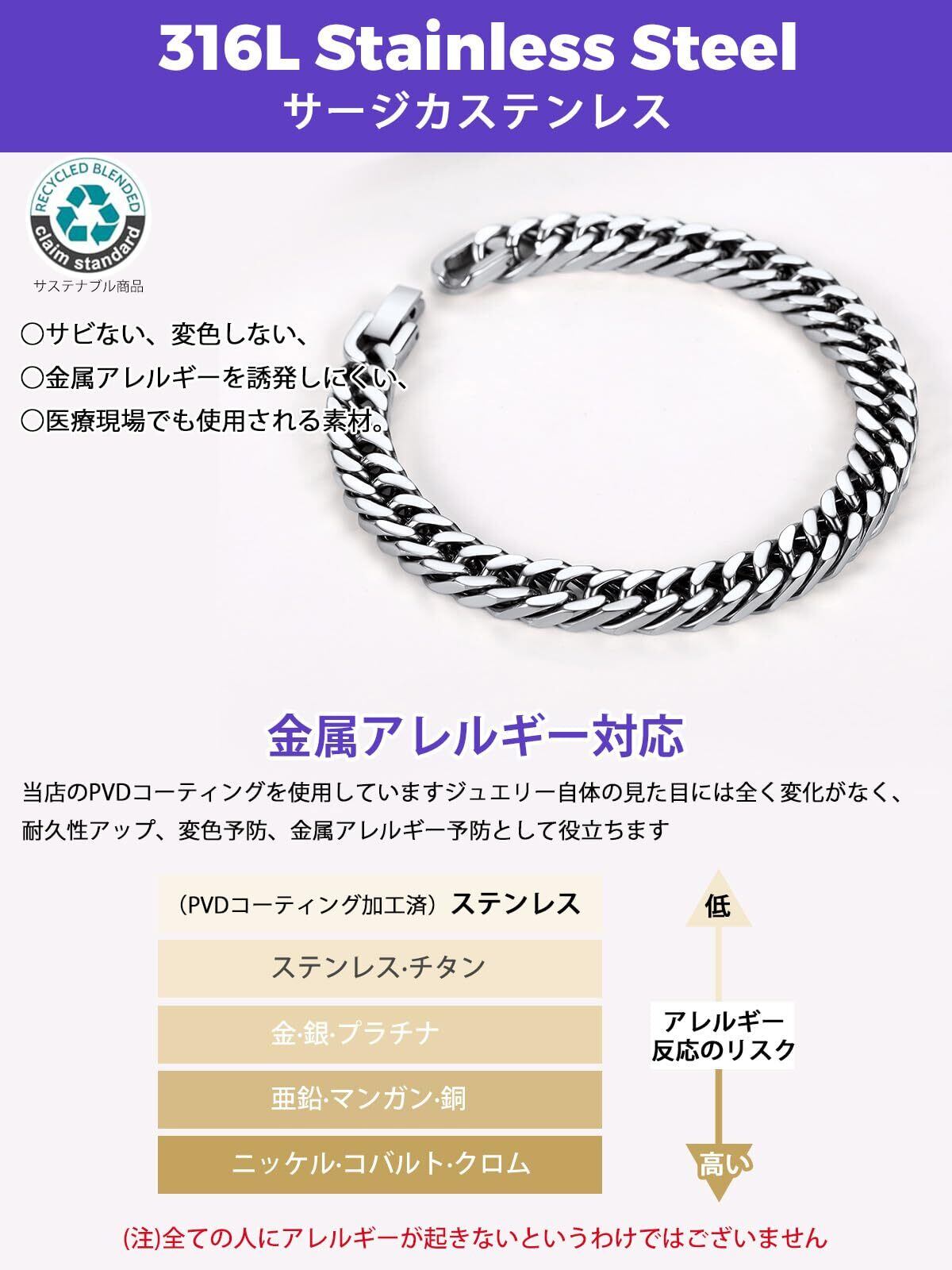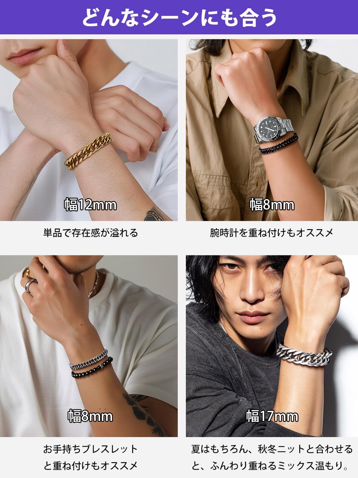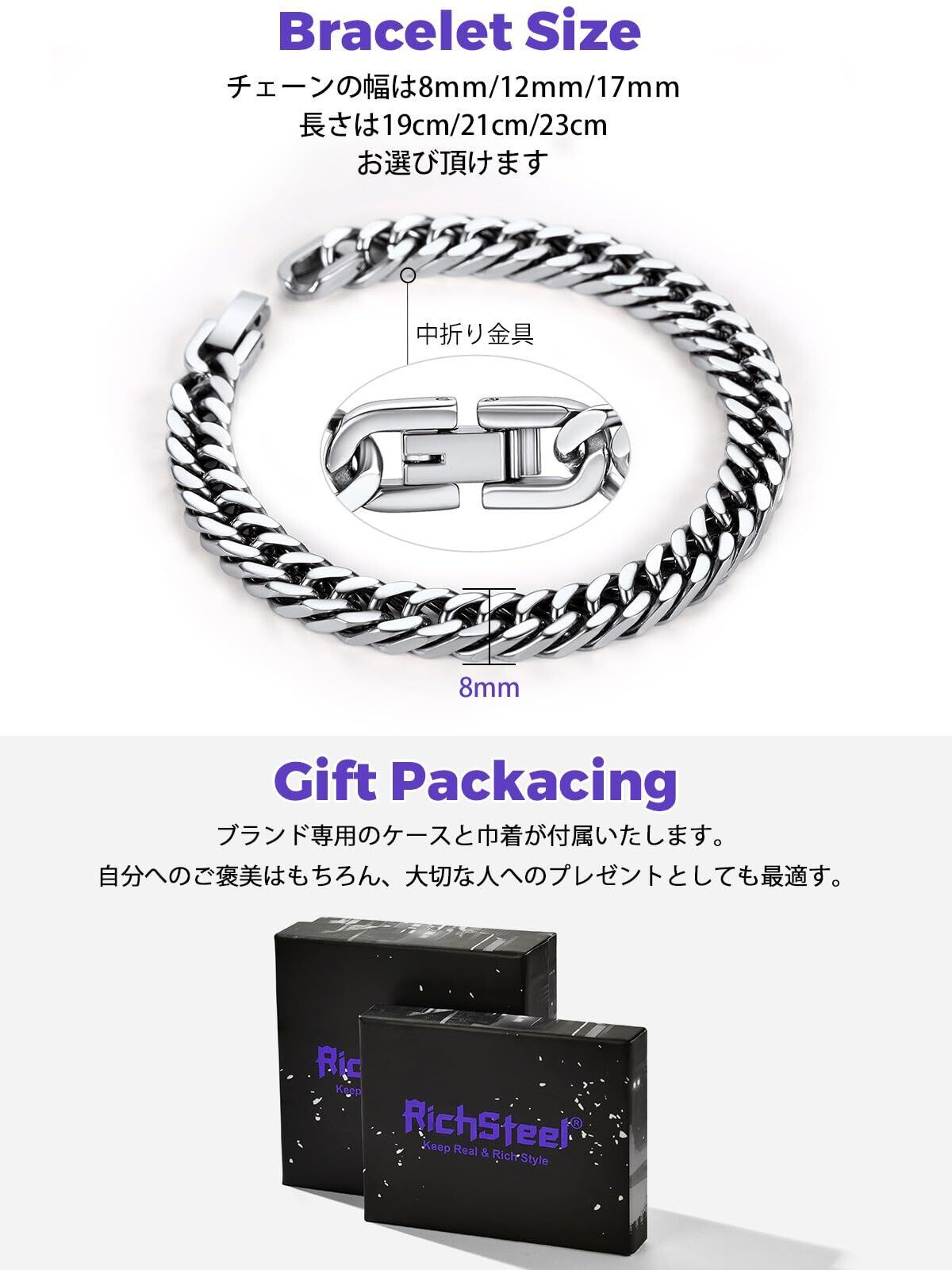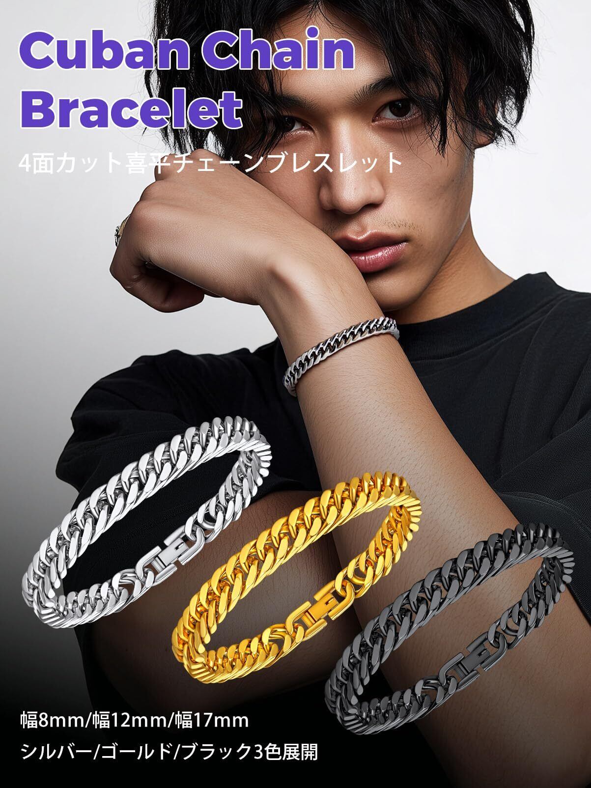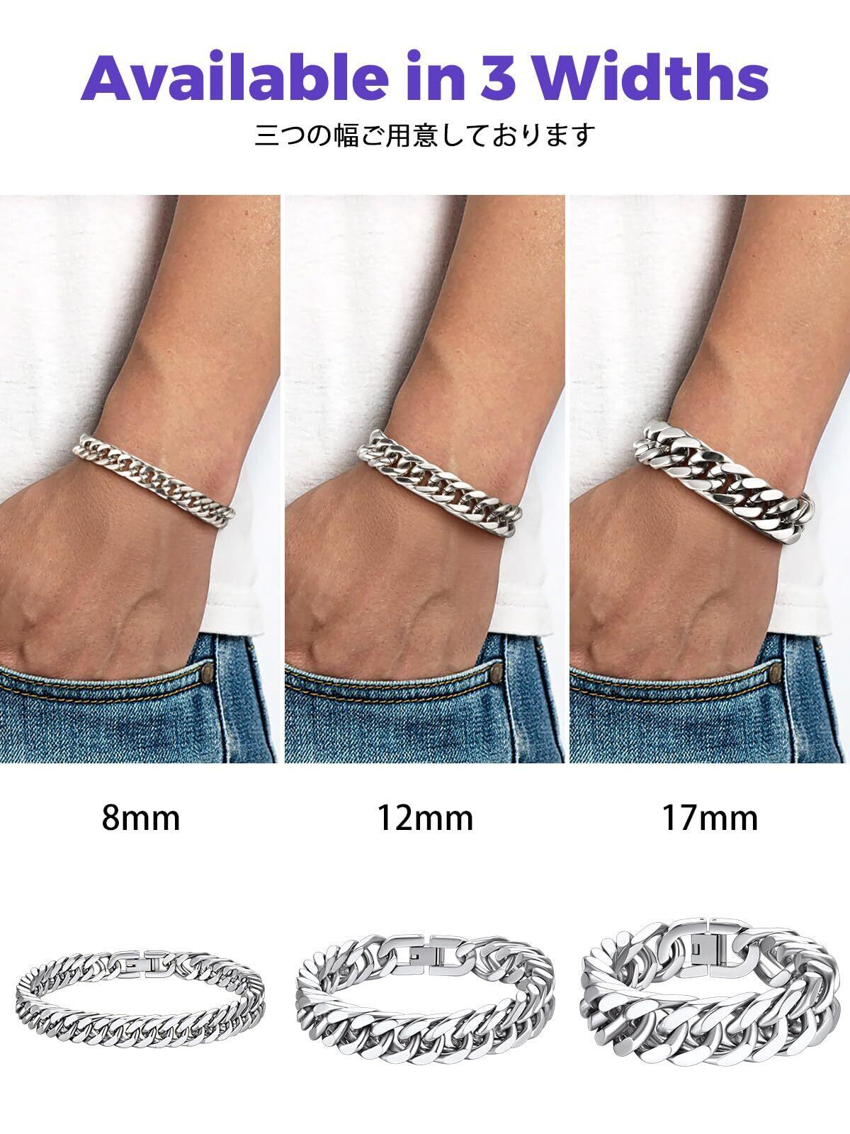 【 豊富なバリエーション】チェーン幅8mm、12mm、17mm、チェーンの長さ19cm、21cm、23cm、色はシルバー・ゴールド・ブラックのそれぞれ計27種類ご用意しております。※一般的な男性の手首周りのサイズは平均17センチ、女性は平均15センチで、チェーンブレスレットの場合は、手首周りプラス2~4センチぐらいがぴったり過ぎず、ちょうどいいサイズと言われています。