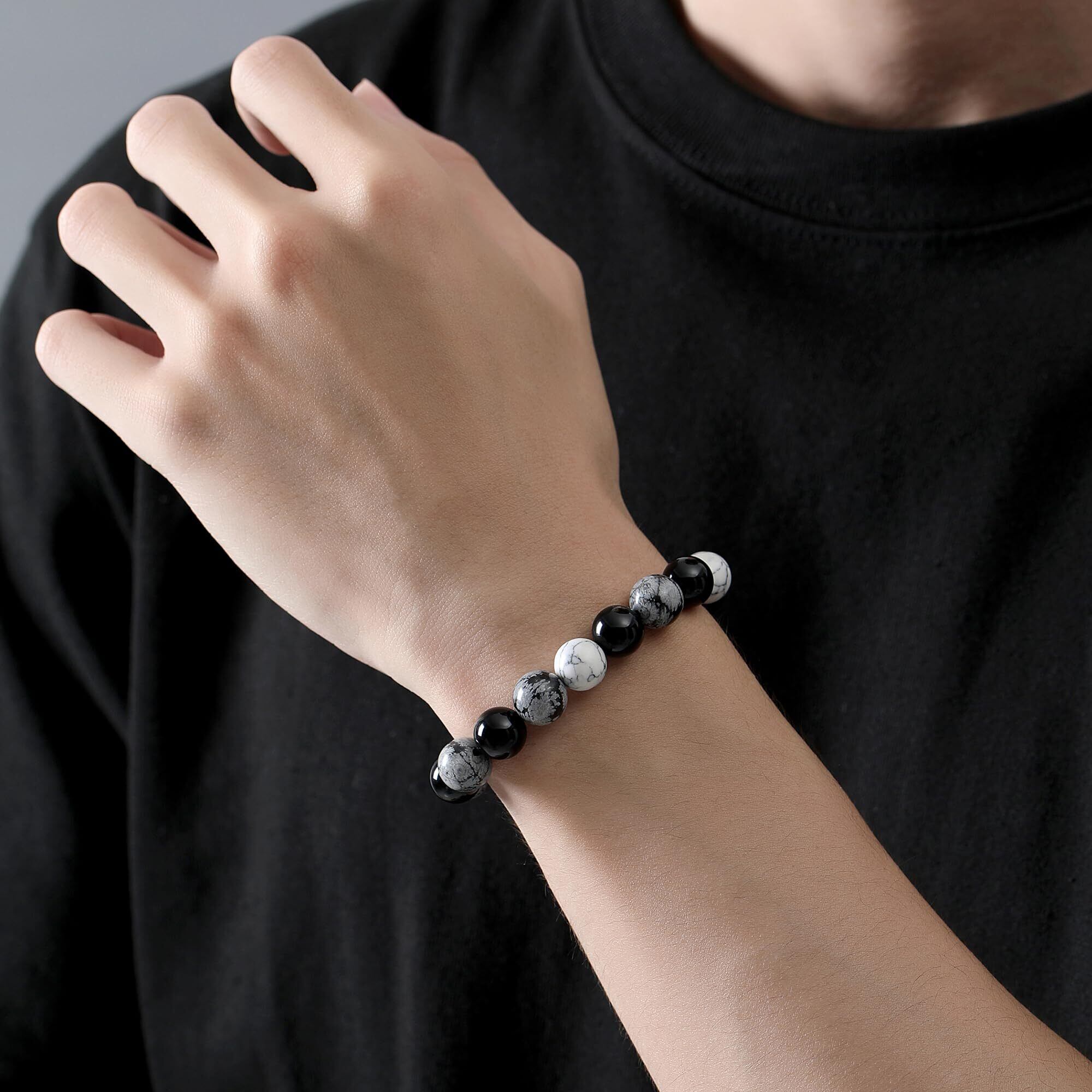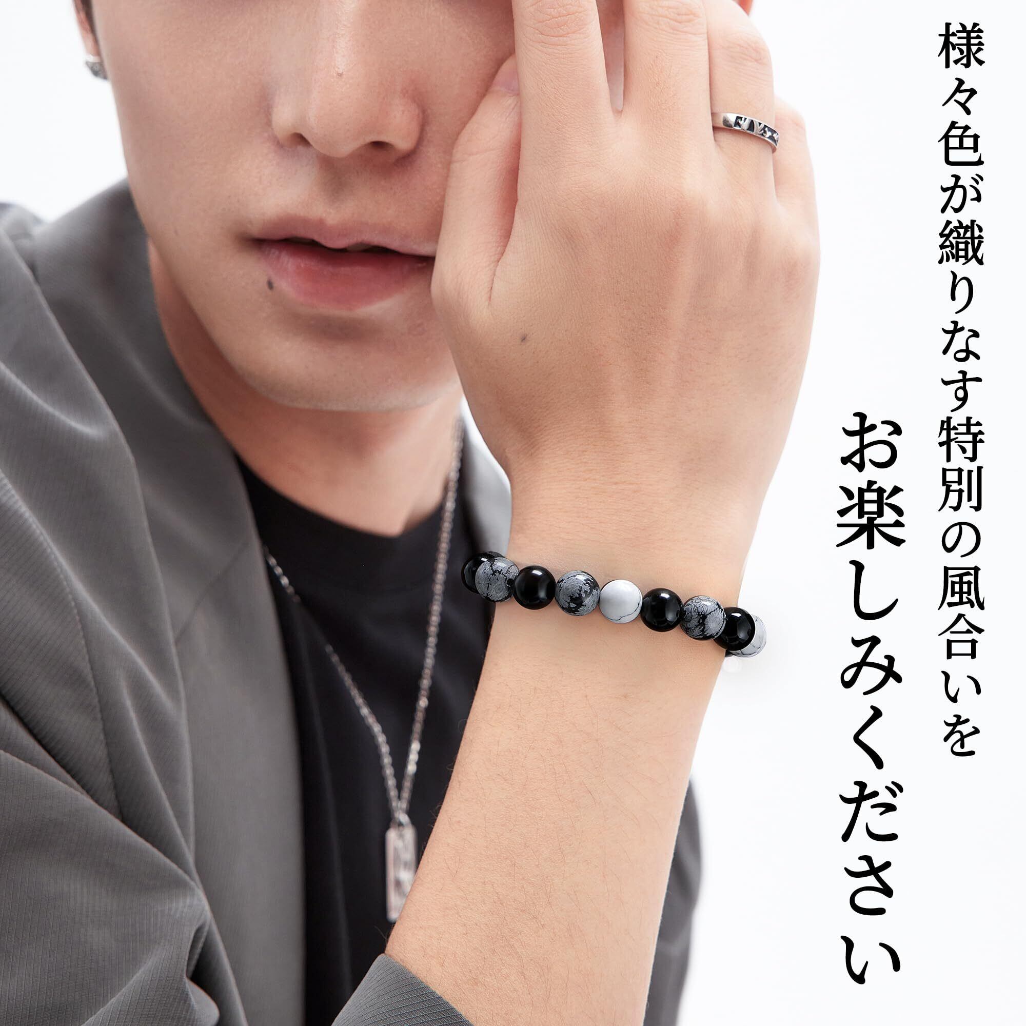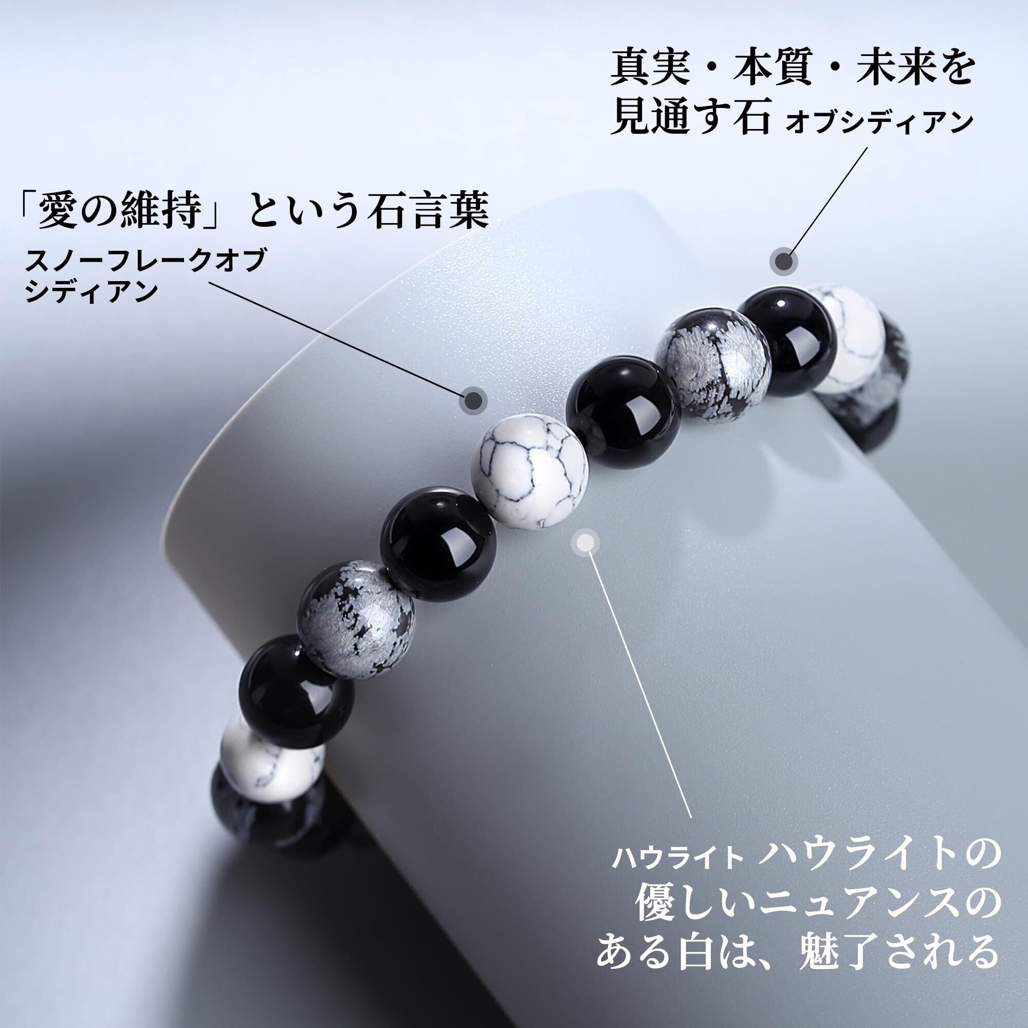 【デザイン】雪の結晶のような斑点模様が見られるスノーフレークオブシディアン。他の石では見られないユニークな見た目が人気を集めています。スノーフレークストーンとハウライトのユニークなテクスチャー、そして色のぶつかり合いは、シンプルでスタイリッシュなブラック、ホワイト、グレーのコンビネーション。 腕元で高いクオリティを発揮し、優しい色合いと、ひとつひとつ表情の違うマーブル模様は男性向けのデザインともよく馴染むのでパワーストーンブレスレットによく使われています。