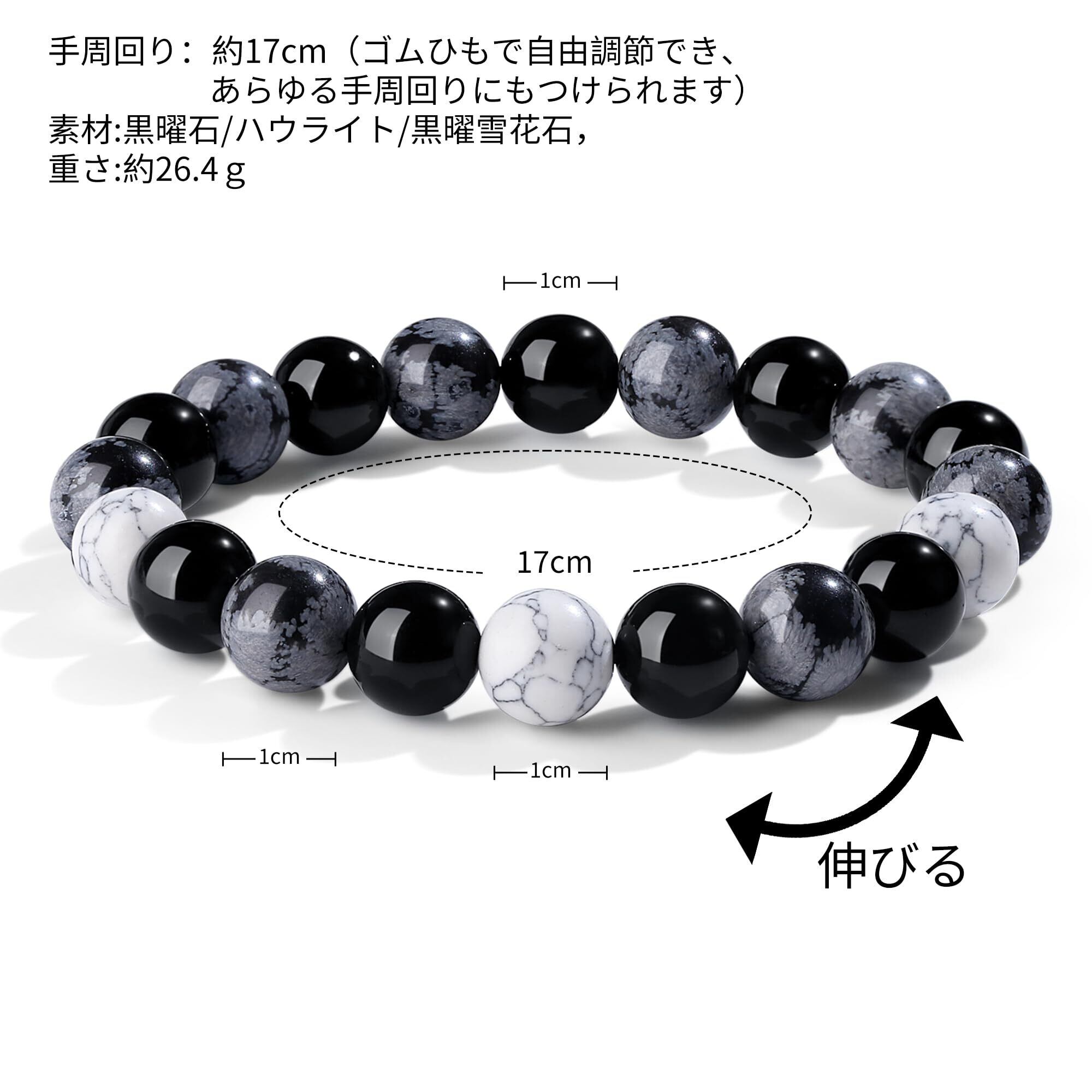 【商品仕様】手首周りサイズ:17cm(調整可能),直径:5.4㎝、サイズ:黒曜石1cm*9個、ハウライト:1cm*3個、黒曜雪花石1cm*8個、素材:黒曜石/ハウライト/黒曜雪花石,重さ:約26.4g,※サイズは多少誤差がある場合がございますので予めご了承ください。