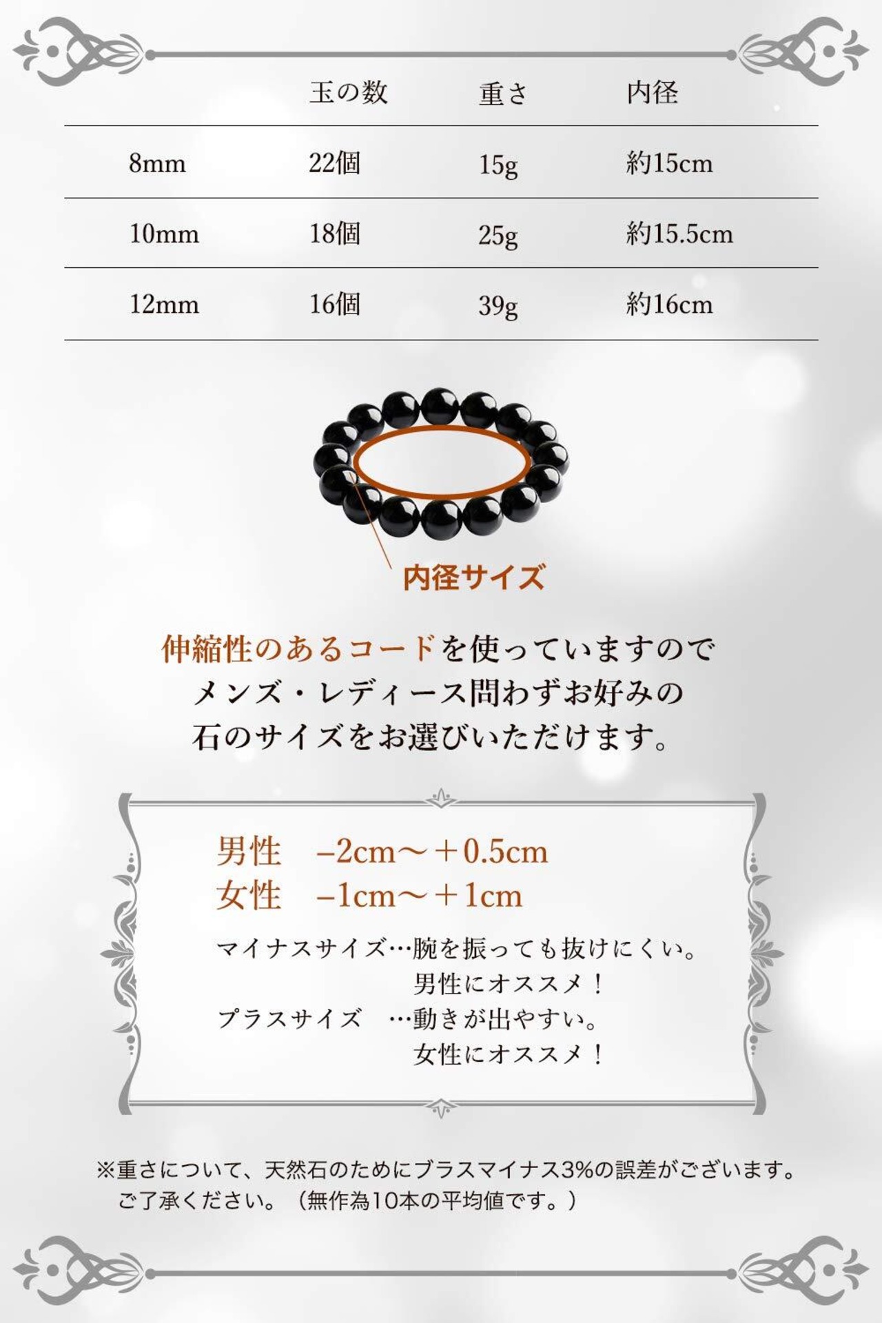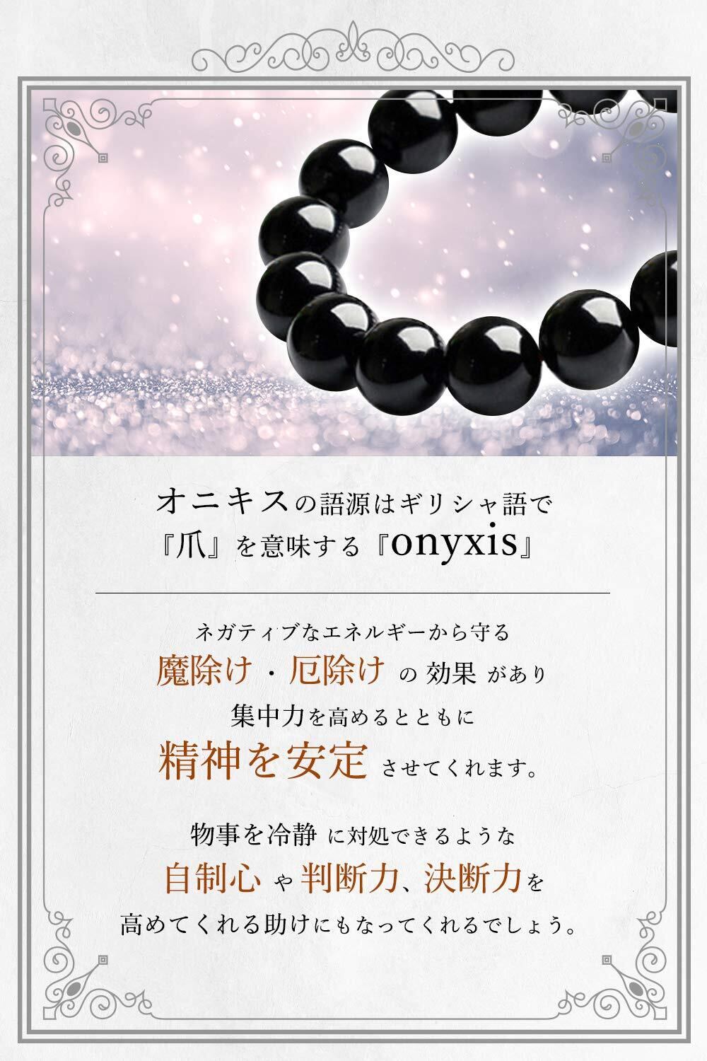 ブラックオニキスは黒色でファッションに取り入れやすいため、非常に高い人気があります。伸縮性のあるコードを使っていますのでメンズ・レディース問わずお好みの石のサイズをお選びいただけます。(8mm、10mm、12mm、10mm+、12mm+)