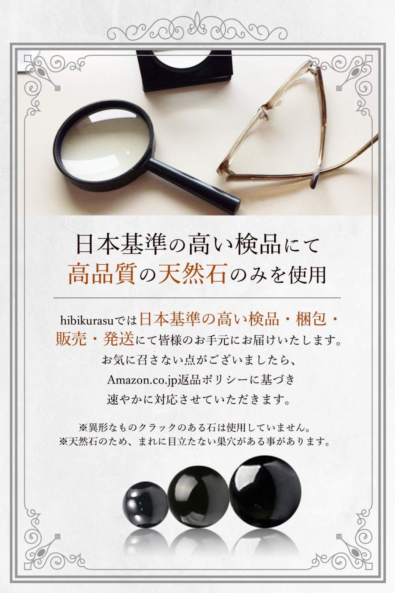 外箱・巾着袋も付属しますので、ご自身のアクセサリーや大切な方へのプレゼントにもオススメです。hibikurasuでは日本基準の高い検品・梱包・販売・発送にて皆様のお手元にお届けいたします。お気に召さない点がございましたら、返品ポリシーに基づき速やかに対応させていただきます。