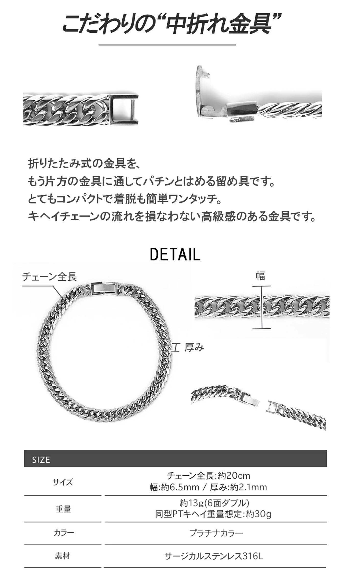 PLUSTER 喜平ブレスレット メンズ プラチナ 6面 30g 20cm ステンレス 316L キヘイ 金属アレルギー対応 [専用ポーチ付き] 人気 ジュエリー プラスター