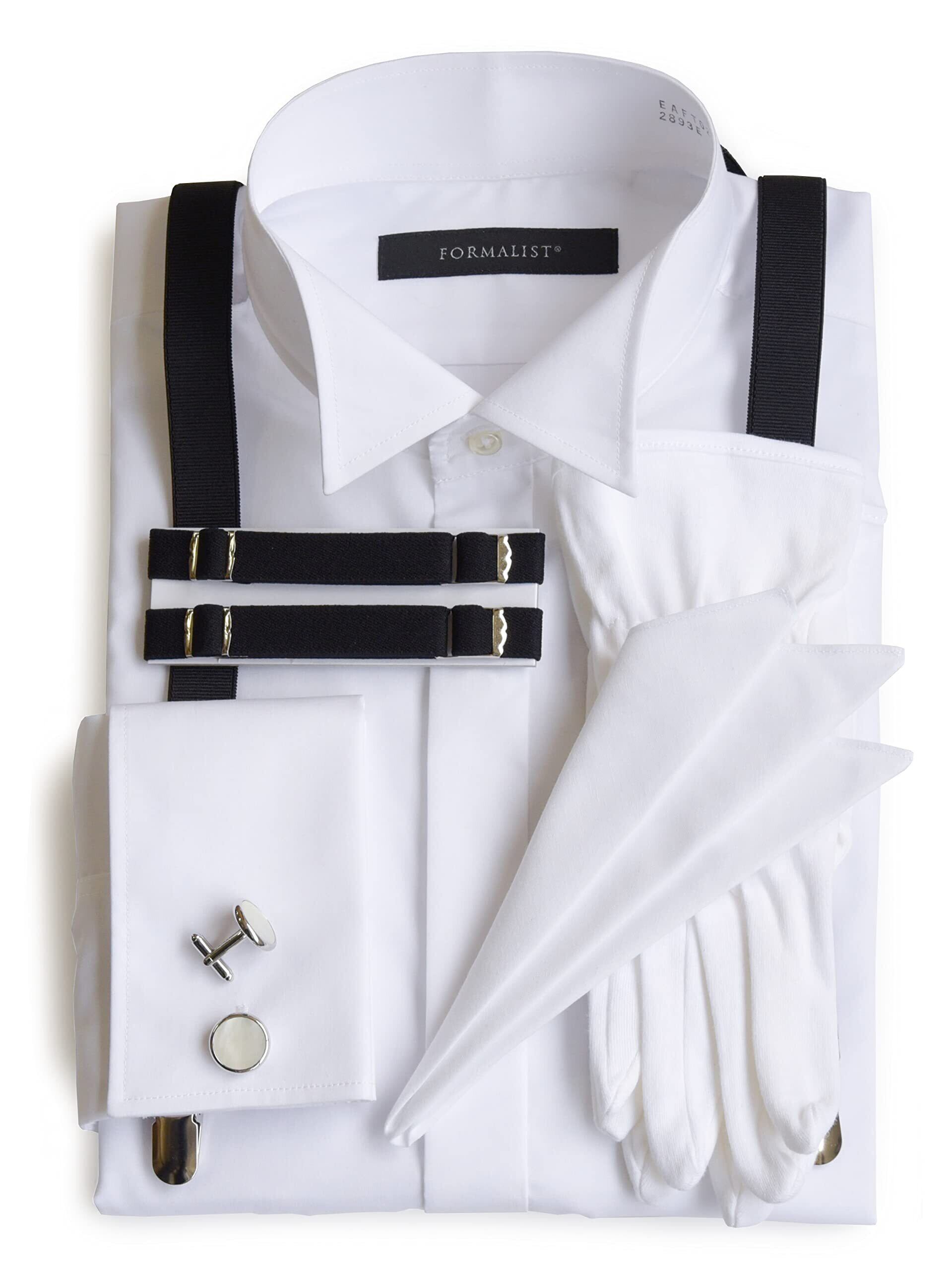 [タキシードステーション] ウイングカラーシャツ小物6点セット【ダブルカフス】 チーフ(綿スリーピークス) カフスボタン白 サスペンダー アームバンド 手袋3