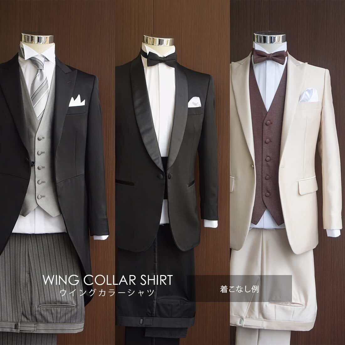 ハイグレードなダブルカフス・ウイングカラーシャツと結婚式に必要なフォーマル小物が揃うコスパセット。ポケットチーフ、カフスボタン、アームバンド、サスペンダー、手袋をパッケージ。